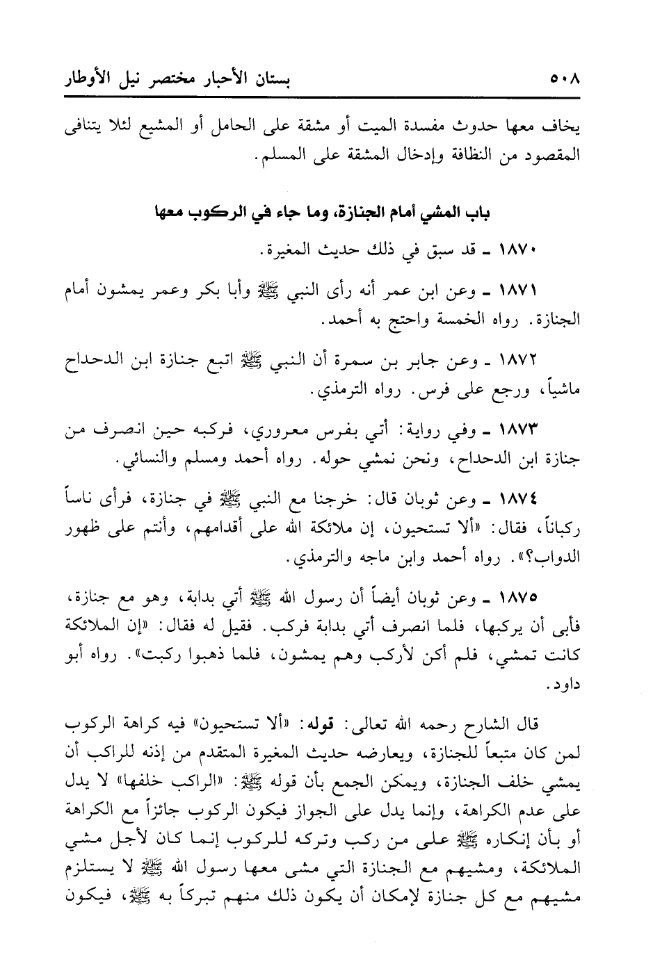 1874- وَعَنْ ثَوْبَانَ قَالَ: خَرَجْنَا مَعَ النَّبِيِّ - صلى الله عليه وسلم - فِي جِنَازَةٍ فَرَأَى نَاسًا رُكْبَانًا فَقَالَ: «أَلَا تَسْتَحْيُونَ إنَّ مَلَائِكَةَ اللَّهِ عَلَى أَقْدَامِهِمْ وَأَنْتُمْ عَلَى ظُهُورِ الدَّوَابِّ» ؟ . رَوَاهُ أَحْمَد وابْنُ مَاجَهْ وَالتِّرْمِذِيُّ.