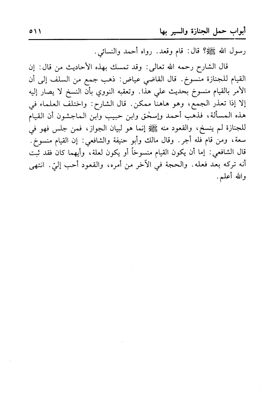 قَالَ الشَّارِحُ رَحِمَهُ اللَّهُ تَعَالَى: وَقَدْ تَمَسَّكَ بِهَذِهِ الْأَحَادِيثِ مَنْ قَالَ: إنَّ الْقِيَامَ لِلْجِنَازَةِ مَنْسُوخٌ. قَالَ الْقَاضِي عِيَاضٌ: ذَهَبَ جَمْعٌ مِنْ السَّلَفِ إلَى أَنَّ الْأَمْرَ بِالْقِيَامِ مَنْسُوخٌ بِحَدِيثِ عَلِيٍّ هَذَا. وَتَعَقَّبَهُ النَّوَوِيُّ بِأَنَّ النَّسْخَ لَا يُصَارُ إلَيْهِ إلَّا إذَا تَعَذَّرَ الْجَمْعُ، وَهُوَ هَا هُنَا مُمْكِنٌ. قَالَ الشَّارِحُ: وَاختلف الْعُلَمَاءُ فِي هَذِهِ الْمَسْأَلَةِ، فَذَهَبَ أَحْمَدُ وَإِسْحَاقُ وَابْنُ حَبِيبٍ وَابْنُ الْمَاجِشُونِ أَنَّ الْقِيَامَ لِلْجِنَازَةِ لَمْ يُنْسَخْ، وَالْقُعُودُ مِنْهُ - صلى الله عليه وسلم - إنَّمَا هُوَ لِبَيَانِ الْجَوَازِ، فَمَنْ جَلَسَ فَهُوَ فِي سَعَةٍ، وَمَنْ قَامَ فَلَهُ أَجْرٌ. وَقَالَ مَالِكٌ وَأَبُو حَنِيفَةَ وَالشَّافِعِيُّ: إنَّ الْقِيَامَ مَنْسُوخٌ. قَالَ الشَّافِعِيُّ: إمَّا أَنْ يَكُونَ الْقِيَامُ مَنْسُوخًا أَوْ يَكُونَ لَعِلَّةٍ، وَأَيُّهُمَا كَانَ، فَقَدْ ثَبَتَ أَنَّهُ تَرَكَهُ بَعْدَ فِعْلِهِ وَالْحُجَّةُ فِي الْآخَرِ مِنْ أَمْرِهِ وَالْقُعُودُ أَحَبُّ إلَيَّ. وَاللهُ أَعْلَمُ.