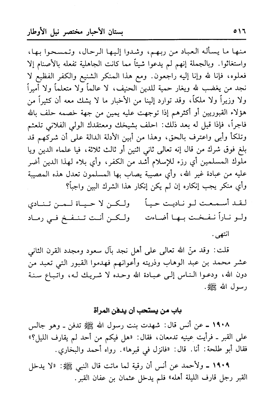 قُلْتُ: وَقَدْ مَنَّ اللهُ تَعَالَى عَلَى أَهْلِ نَجْدٍ بِآلِ سُعُودٍ وَمُجَدِّدِ الْقَرْن الثَّانِي عَشَر مُحَمَّدِ بنِ عَبْدِ الْوَهَابِ وَذُرِّيَتِهِ وَأَعْوَانِهِمْ فَهَدَمُوا الْقُبُورَ الَّتِي تُعْبَدُ مِنْ دُونِ اللهِ تَعَالَى وَدَعوا النَّاسَ إِلَى عِبَادَةِ اللهِ وَحْدَهُ لا شَرِيكَ لَهُ وَإِتِبَاعِ سُنَّةِ رَسُولِهِ - صلى الله عليه وسلم -.