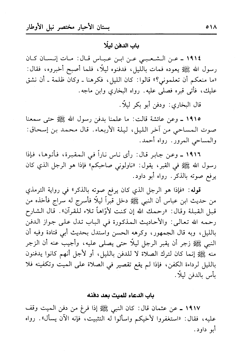 قَالَ الشَّارِحُ رَحِمَهُ اللَّهُ تَعَالَى: وَالْأَحَادِيثُ الْمَذْكُورَةُ فِي الْبَابِ تَدُلُّ عَلَى جَوَازِ الدَّفْنِ بِاللَّيْلِ، وَبِهِ قَالَ الْجُمْهُورُ، وَكَرِهَهُ الْحَسَنُ الْبَصْرِيُّ وَاسْتَدَلَّ بِحَدِيثِ أَبِي قَتَادَةَ، وَفِيهِ أَنَّ النَّبِيَّ - صلى الله عليه وسلم - زَجَرَ أَنْ يُقْبَرَ الرَّجُلُ لَيْلًا حَتَّى يُصَلَّى عَلَيْهِ. وَأُجِيبَ عَنْهُ أَنَّ الزَّجْرَ مِنْهُ - صلى الله عليه وسلم - إنَّمَا كَانَ لِتَرْكِ الصَّلَاةِ لَا لِلدَّفْنِ بِاللَّيْلِ، أَوْ لِأَجْلِ أَنَّهُمْ كَانُوا يَدْفِنُونَ بِاللَّيْلِ لِرَدَاءَةِ الْكَفَنِ. فَإِذَا لَمْ يَقَعْ تَقْصِيرٌ فِي الصَّلَاةِ عَلَى الْمَيِّتِ وَتَكْفِينِهِ فَلَا بَأْسَ بِالدَّفْنِ لَيْلًا.