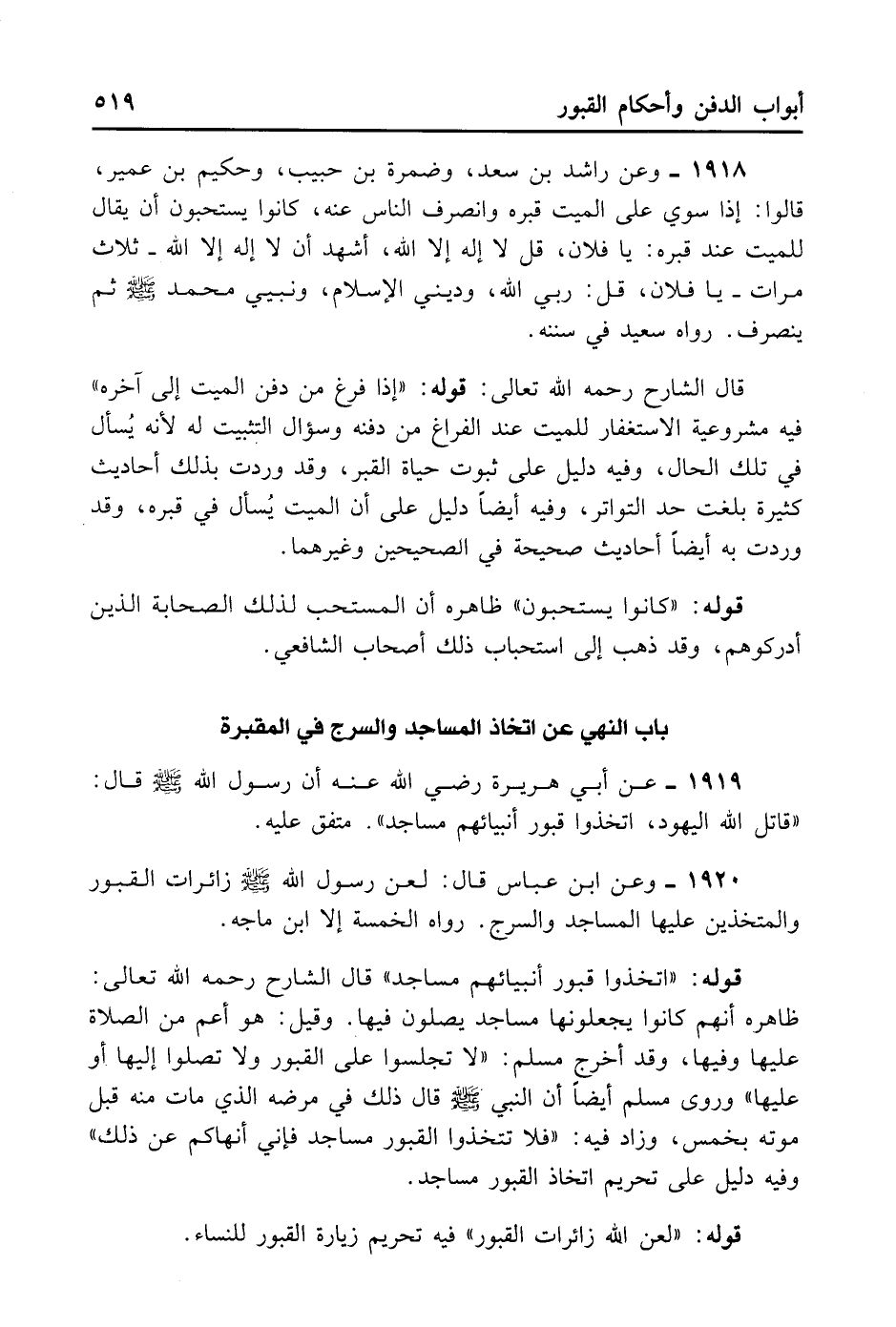 1920- وَعَنْ ابْنِ عَبَّاسٍ قَالَ: لَعَنَ رَسُولُ اللَّهِ - صلى الله عليه وسلم - زَائِرَاتِ الْقُبُورِ وَالْمُتَّخِذِينَ عَلَيْهَا الْمَسَاجِدَ وَالسُّرُجَ. رَوَاهُ الْخَمْسَةُ إلَّا ابْنَ مَاجَهْ.