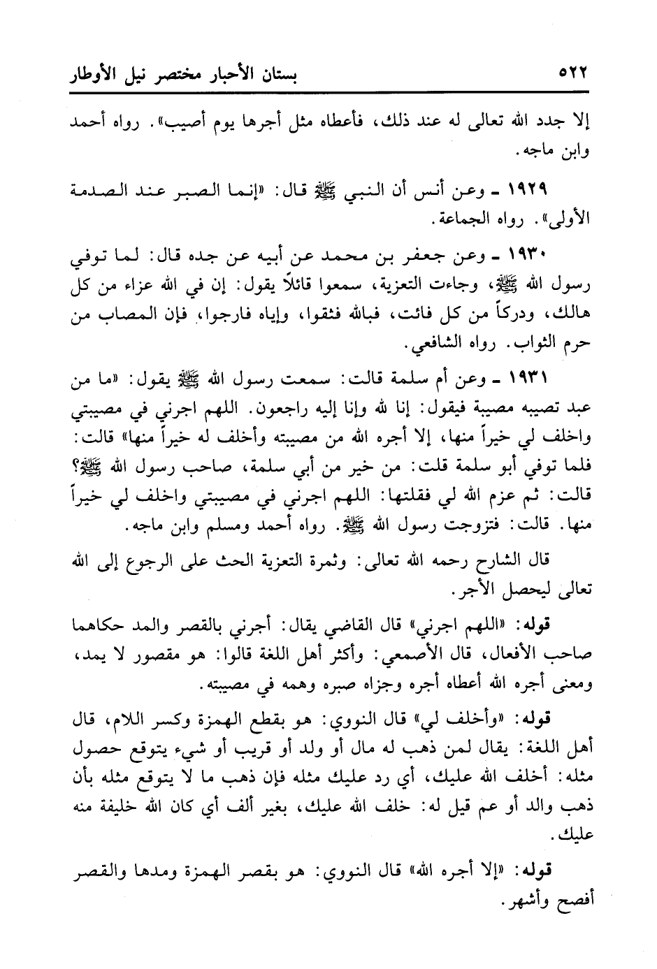 1931- وَعَنْ أُمِّ سَلَمَةَ قَالَتْ: سَمِعْت رَسُولَ اللَّهِ - صلى الله عليه وسلم - يَقُولُ: «مَا مِنْ عَبْدٍ تُصِيبُهُ مُصِيبَةٌ فَيَقُولُ: إنَّا لِلَّهِ وَإِنَّا إلَيْهِ رَاجِعُونَ، اللَّهُمَّ أْجُرْنِي فِي مُصِيبَتِي وَأَخْلِفْ لِي خَيْرًا مِنْهَا إلَّا أَجَرَهُ اللَّهُ مِن مُصِيبَتِهِ وَأَخْلَفَ لَهُ خَيْرًا مِنْهَا، قَالَتْ: فَلَمَّا تُوُفِّيَ أَبُو سَلَمَةَ قَالَتْ: مَنْ خَيْرٌ مِنْ أَبِي سَلَمَةَ صَاحِبِ رَسُولِ اللَّهِ - صلى الله عليه وسلم -،