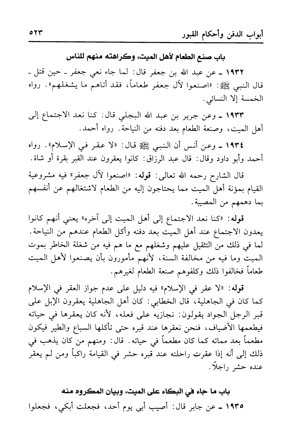 1933- وَعَنْ جَرِيرِ بْنِ عَبْدِ اللَّهِ الْبَجَلِيِّ قَالَ: كُنَّا نَعُدُّ الِاجْتِمَاعَ إلَى أَهْلِ الْمَيِّتِ وَصَنْعَةَ الطَّعَامِ بَعْدَ دَفْنِهِ مِنْ النِّيَاحَةِ رَوَاهُ أَحْمَدُ.