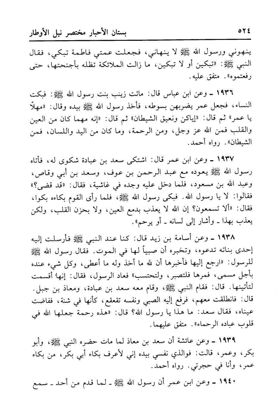 1938- وَعَنْ أُسَامَةَ بْنِ زَيْدٍ قَالَ: كُنَّا عِنْدَ النَّبِيِّ - صلى الله عليه وسلم -، فَأَرْسَلَتْ إلَيْهِ إحْدَى بَنَاتِهِ تَدْعُوهُ وَتُخْبِرُهُ أَنَّ صَبِيًّا لَهَا فِي الْمَوْتِ، فَقَالَ رَسُولُ اللَّهِ - صلى الله عليه وسلم -: لِلرَّسُول «ارْجِعْ إلَيْهَا فَأَخْبِرْهَا أَنَّ لِلَّهِ مَا أَخَذَ وَلَهُ مَا أَعْطَى، وَكُلُّ شَيْءٍ عِنْدَهُ بِأَجَلٍ مُسَمًّى، فَمُرْهَا فَلْتَصْبِرْ وَلْتَحْتَسِبْ» . فَعَادَ الرَّسُولُ فَقَالَ: إنَّهَا أَقْسَمَتْ لَتَأْتِيَنَّهَا، قَالَ: فَقَامَ النَّبِيُّ - صلى الله عليه وسلم - وَقَامَ مَعَهُ سَعْدُ بْنُ عُبَادَةَ وَمُعَاذُ بْنُ جَبَلٍ، قَالَ: فَانْطَلَقْتُ مَعَهُمْ، فَرُفِعَ إلَيْهِ الصَّبِيُّ وَنَفْسُهُ تَقَعْقَعُ كَأَنَّهَا فِي شَنَّةٍ فَفَاضَتْ عَيْنَاهُ، فَقَالَ سَعْدٌ: مَا هَذَا يَا رَسُولَ اللَّهِ؟ قَالَ: «هَذِهِ رَحْمَةٌ جَعَلَهَا اللَّهُ فِي قُلُوبِ عِبَادِهِ الرُّحَمَاءَ» . مُتَّفَقٌ عَلَيْهِمَا.