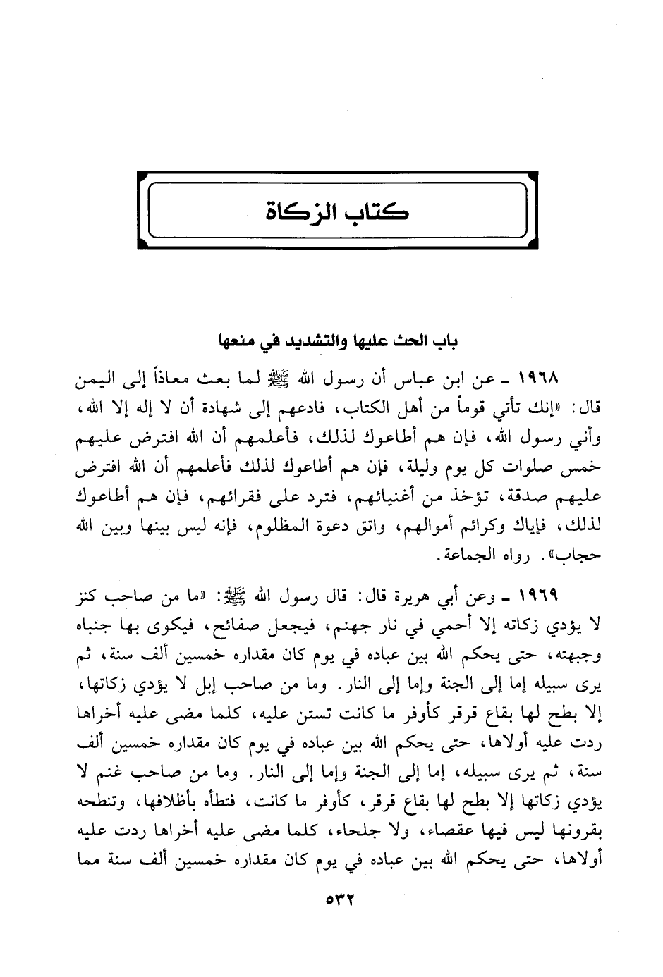 1969- وَعَنْ أَبِي هُرَيْرَةَ قَالَ: قَالَ رَسُولُ اللَّهِ - صلى الله عليه وسلم -: «مَا مِنْ صَاحِبِ كَنْزٍ لَا يُؤَدِّي زَكَاتَهُ إلَّا أُحْمِيَ عَلَيْهِ فِي نَارِ جَهَنَّمَ فَيُجْعَلُ صَفَائِحَ فَيُكْوَى بِهَا جَنْبَاهُ وَجَبْهَتُهُ حَتَّى يَحْكُمَ اللَّهُ بَيْنَ عِبَادِهِ فِي يَوْمٍ كَانَ مِقْدَارُهُ خَمْسِينَ أَلْفَ سَنَةٍ، ثُمَّ يُرَى سَبِيلُهُ، إمَّا إلَى الْجَنَّةِ، وَإِمَّا إلَى النَّارِ، وَمَا مِنْ صَاحِبِ إبِلٍ لَا يُؤَدِّي زَكَاتَهَا، إلَّا بُطِحَ لَهَا بِقَاعٍ قَرْقَرٍ كَأَوْفَرِ مَا كَانَتْ تَسْتَنُّ عَلَيْهِ، كُلَّمَا مَضَى عَلَيْهِ أُخْرَاهَا رُدَّتْ عَلَيْهِ أُولَاهَا حَتَّى يَحْكُمَ اللَّهُ بَيْنَ عِبَادِهِ فِي يَوْمٍ كَانَ مِقْدَارُهُ خَمْسِينَ أَلْفَ سَنَةٍ،