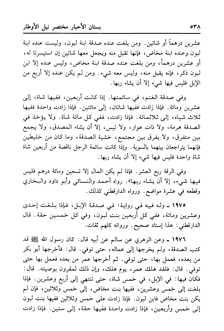 1976- وَعَنْ الزُّهْرِيِّ عَنْ سَالِمٍ عَنْ أَبِيهِ قَالَ: كَانَ رَسُولُ اللَّهِ - صلى الله عليه وسلم - قَدْ كَتَبَ الصَّدَقَةَ وَلَمْ يُخْرِجْهَا إلَى عُمَّالِهِ حَتَّى تُوُفِّيَ، قَالَ: فَأَخْرَجَهَا أَبُو بَكْرٍ مِنْ بَعْدِهِ فَعَمِلَ بِهَا حَتَّى تُوُفِّيَ؛ ثُمَّ أَخْرَجَهَا عُمَرُ مِنْ بَعْدِهِ فَعَمِلَ بِهَا حَتَّى تُوفِّي، قَالَ: فَلَقَدْ هَلَكَ عُمَرُ يَوْمَ هَلَكَ وَإِنَّ ذَلِكَ لَمَقْرُونٌ بِوَصِيَّتِهِ، قَالَ: فَكَانَ فِيهَا فِي الْإِبِلِ فِي خَمْسٍ شاة حَتَّى تَنْتَهِيَ إلَى أَرْبَعٍ وَعِشْرِينَ؛ فَإِذَا بَلَغَتْ إلَى خَمْسٍ وَعِشْرِينَ فَفِيهَا بِنْتُ مَخَاضٍ إلَى خَمْسٍ وَثَلَاثِينَ؛ فَإِنْ لَمْ تَكُنْ بِنْتُ مَخَاضٍ فَابْنُ