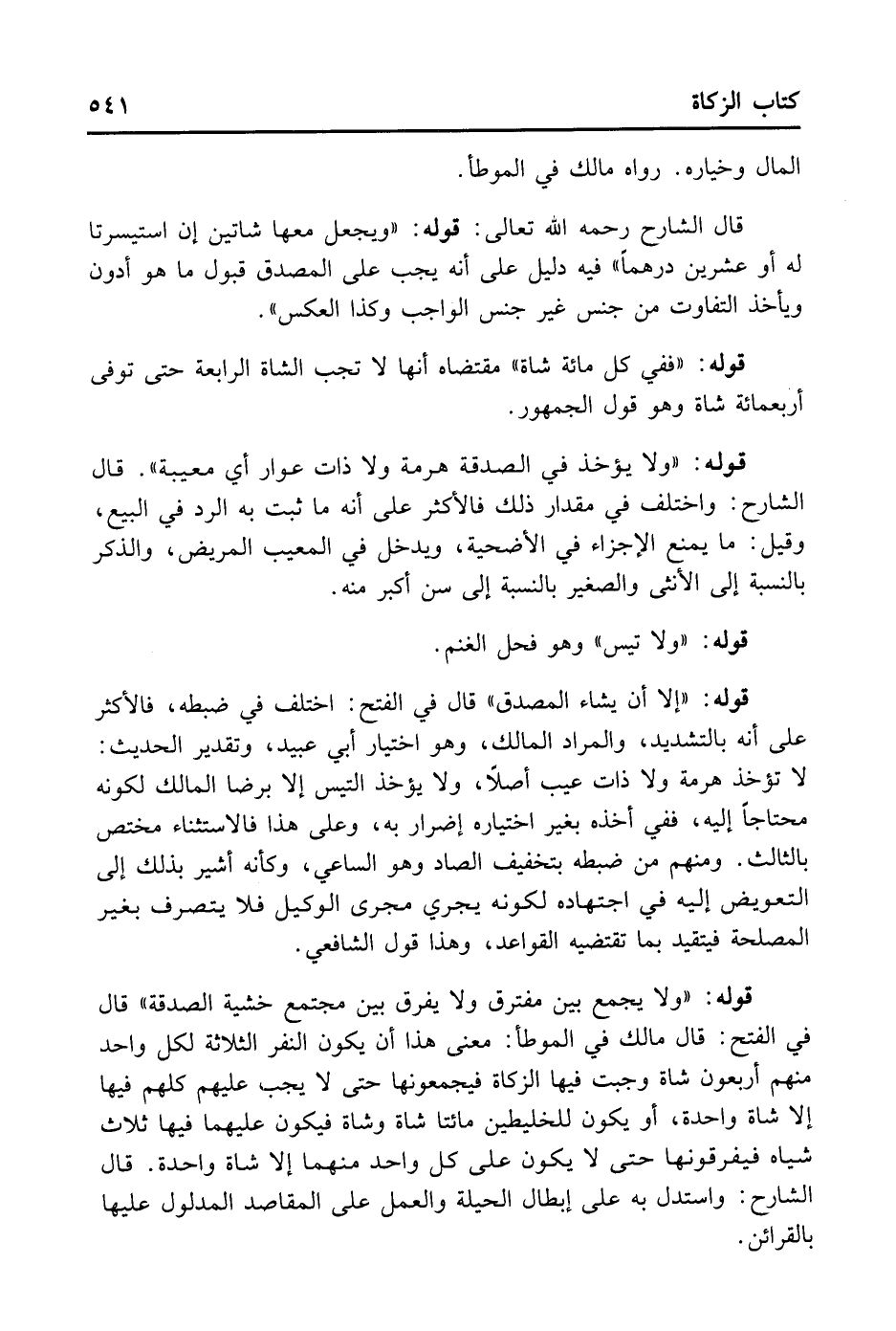 قَوْلُهُ: (وَلَا يُجْمَعُ بَيْنَ مُفْتَرِقٍ وَلَا يُفَرَّقُ بَيْنَ مُجْتَمِعٍ خَشْيَةَ الصَّدَقَةِ) . قَالَ فِي الْفَتْحِ: قَالَ مَالِكٌ فِي الْمُوَطَّأِ: مَعْنَى هَذَا أَنْ يَكُونَ النَّفَرُ الثَّلَاثَةُ لِكُلِّ وَاحِدٍ مِنْهُمْ أَرْبَعُونَ شَاةً وَجَبَتْ فِيهَا الزَّكَاةُ فَيَجْمَعُونَهَا حَتَّى لَا يَجِبَ عَلَيْهِمْ كُلِّهِمْ فِيهَا إلَّا شَاةٌ وَاحِدَةٌ، أَوْ يَكُونُ لِلْخَلِيطَيْنِ مِائَتَا شَاةٍ وَشَاةٌ فَيَكُونُ عَلَيْهِمَا فِيهَا ثَلَاثُ شِيَاهٍ، فَيُفَرِّقُونَهَا حَتَّى لَا يَكُونَ عَلَى كُلِّ وَاحِدٍ مِنْهُمَا إلَّا شَاةٌ وَاحِدَةٌ. وَاسْتُدِلَّ بِهِ عَلَى إبْطَالِ الْحِيلَةِ وَالْعَمَلِ عَلَى الْمَقَاصِدِ الْمَدْلُولِ عَلَيْهَا بِالْقَرَائِنِ.