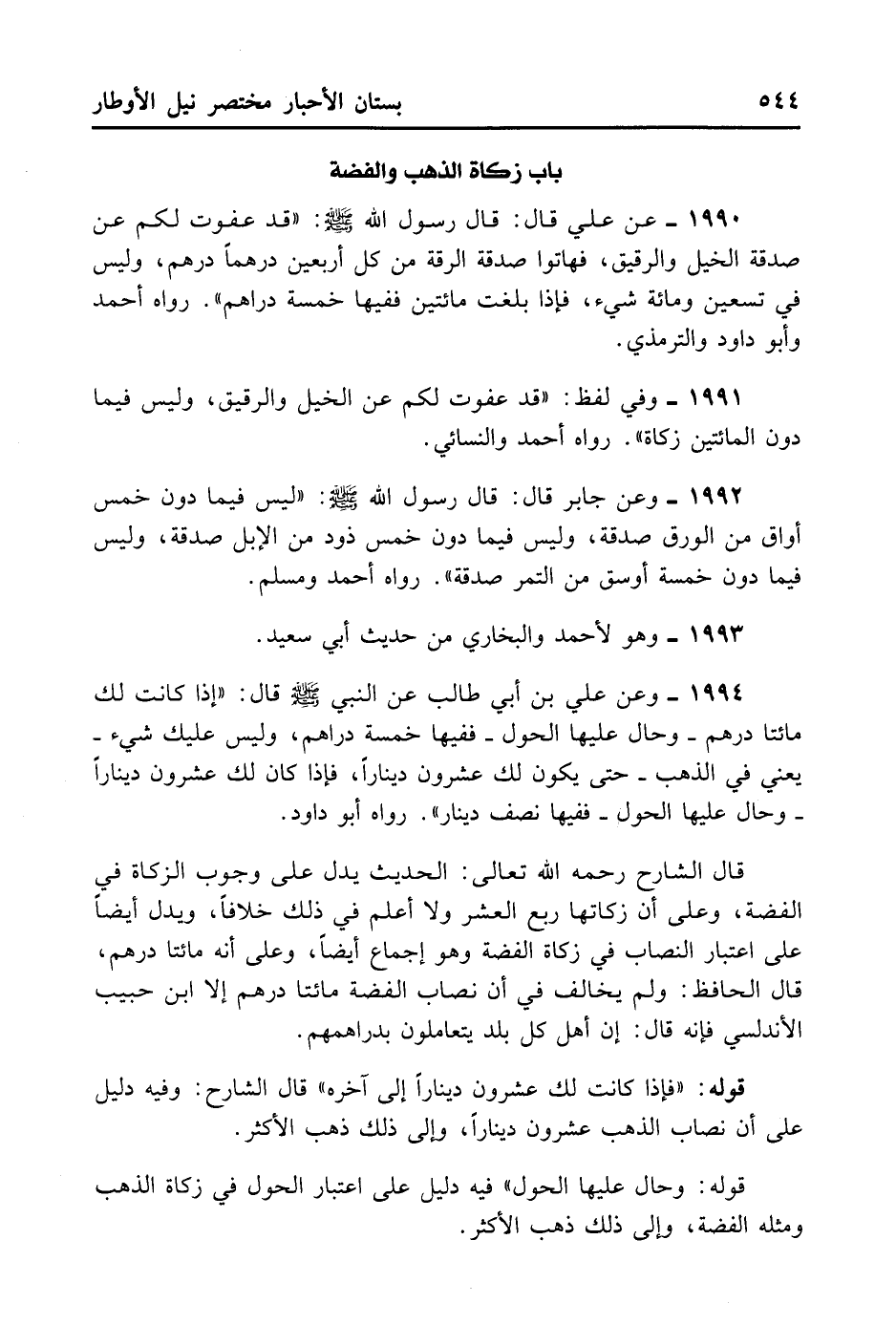 قَالَ الشَّارِحُ رَحِمَهُ اللَّهُ تَعَالَى: الْحَدِيثُ يَدُلُّ عَلَى وُجُوبِ الزَّكَاةِ فِي الْفِضَّةِ، وَعَلَى أَنَّ زَكَاتَهَا رُبْعُ الْعُشْرِ وَلَا أَعْلَمُ فِي ذَلِكَ خِلَافًا. وَيَدُلُّ أَيْضًا عَلَى اعْتِبَارِ النِّصَابِ فِي زَكَاةِ الْفِضَّةِ، وَهُوَ إجْمَاعٌ أَيْضًا وَعَلَى أَنَّهُ مِائَتَا دِرْهَمٍ. قَالَ الْحَافِظُ: وَلَمْ يُخَالِفْ فِي أَنَّ نِصَابَ الْفِضَّةِ مِائَتَا دِرْهَمٍ إلَّا ابْنُ حَبِيبٍ الْأَنْدَلُسِيُّ فَإِنَّهُ قَالَ: إنَّ أَهْلَ كُلِّ بَلَدٍ يَتَعَامَلُونَ بِدَرَاهِمِهِمْ.