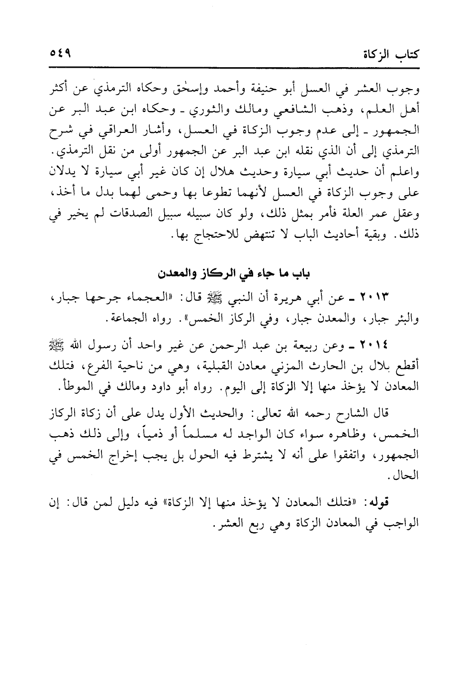 الزَّكَاةِ فِي الْعَسَلِ لِأَنَّهُمَا تَطَوَّعَا بِهَا وَحَمَى لَهُمَا بَدَلَ مَا أَخَذَ، وَعَقَلَ عُمَرُ الْعِلَّةَ فَأَمَرَ بِمِثْلِ ذَلِكَ، وَلَوْ كَانَ سَبِيلُهُ سَبِيلَ الصَّدَقَاتِ لَمْ يُخَيِّرْ فِي ذَلِكَ. وَبَقِيَّةُ أَحَادِيثِ الْبَابِ لَا تَنْتَهِضُ لِلِاحْتِجَاجِ بِهَا.