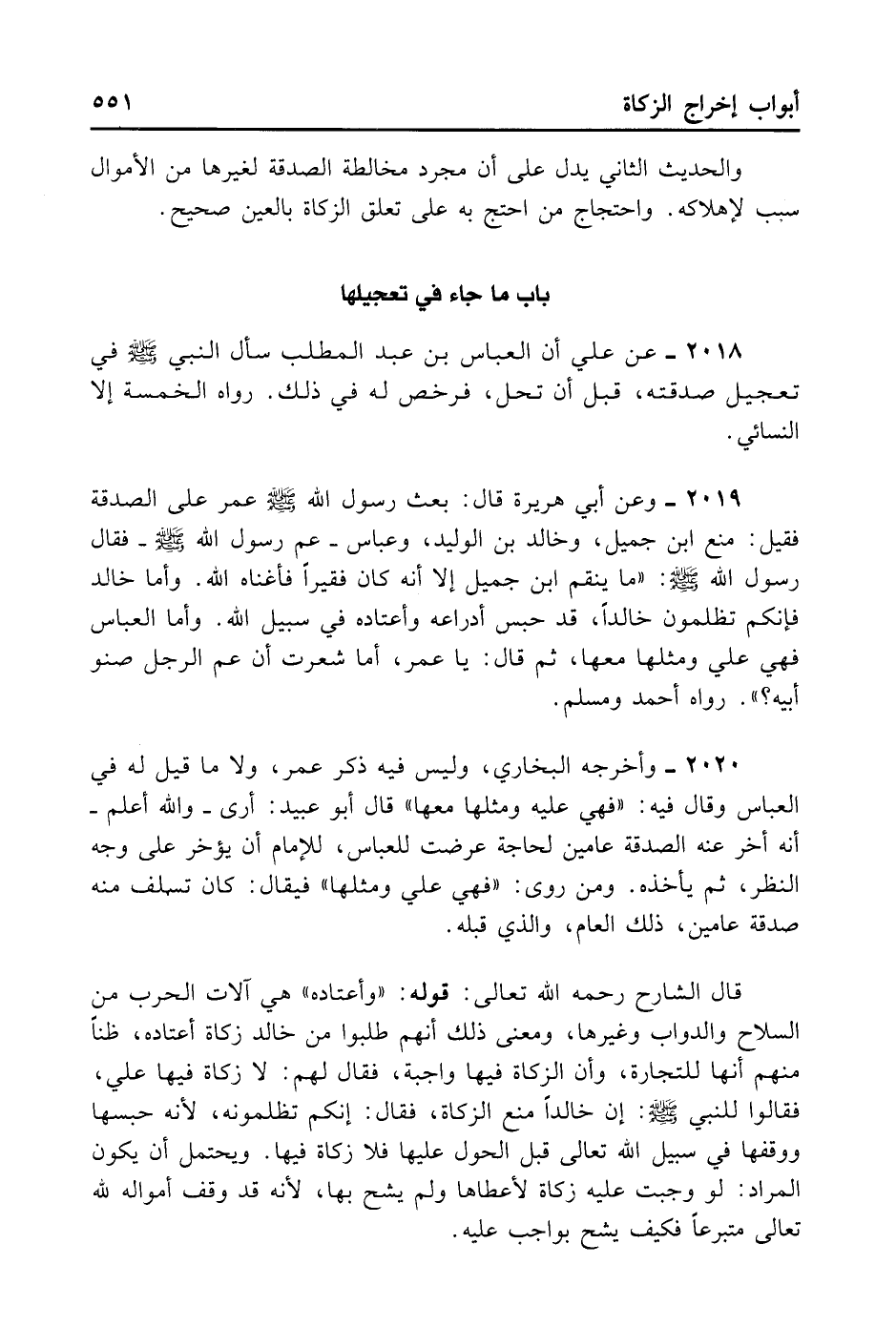 2019- وَعَنْ أَبِي هُرَيْرَةَ قَالَ: بَعَثَ رَسُولُ اللَّهِ - صلى الله عليه وسلم - عُمَرَ عَلَى الصَّدَقَةِ، فَقِيلَ: مَنَعَ ابْنُ جَمِيلٍ وَخَالِدُ بْنُ الْوَلِيدِ وَعَبَّاسٌ عَمُّ رَسُولِ اللهِ - صلى الله عليه وسلم -، فَقَالَ رَسُولُ اللَّهِ - صلى الله عليه وسلم -: «مَا يَنْقِمُ ابْنُ جَمِيلٍ إلَّا أَنَّهُ كَانَ فَقِيرًا فَأَغْنَاهُ اللَّهُ، وَأَمَّا خَالِدٌ فَإِنَّكُمْ تَظْلِمُونَ خَالِدًا، قَدْ احْتَبَسَ أَدْرَاعَهُ وَأَعْتَادَهُ فِي سَبِيلِ اللَّهِ، وَأَمَّا الْعَبَّاسُ فَهِيَ عَلَيَّ وَمِثْلُهَا مَعَهَا» . ثُمَّ قَالَ: «يَا عُمَرُ أَمَا شَعَرْت أَنَّ عَمَّ الرَّجُلِ صِنْوُ أَبِيهِ» ؟ . رَوَاهُ أَحْمَدُ وَمُسْلِمٌ.