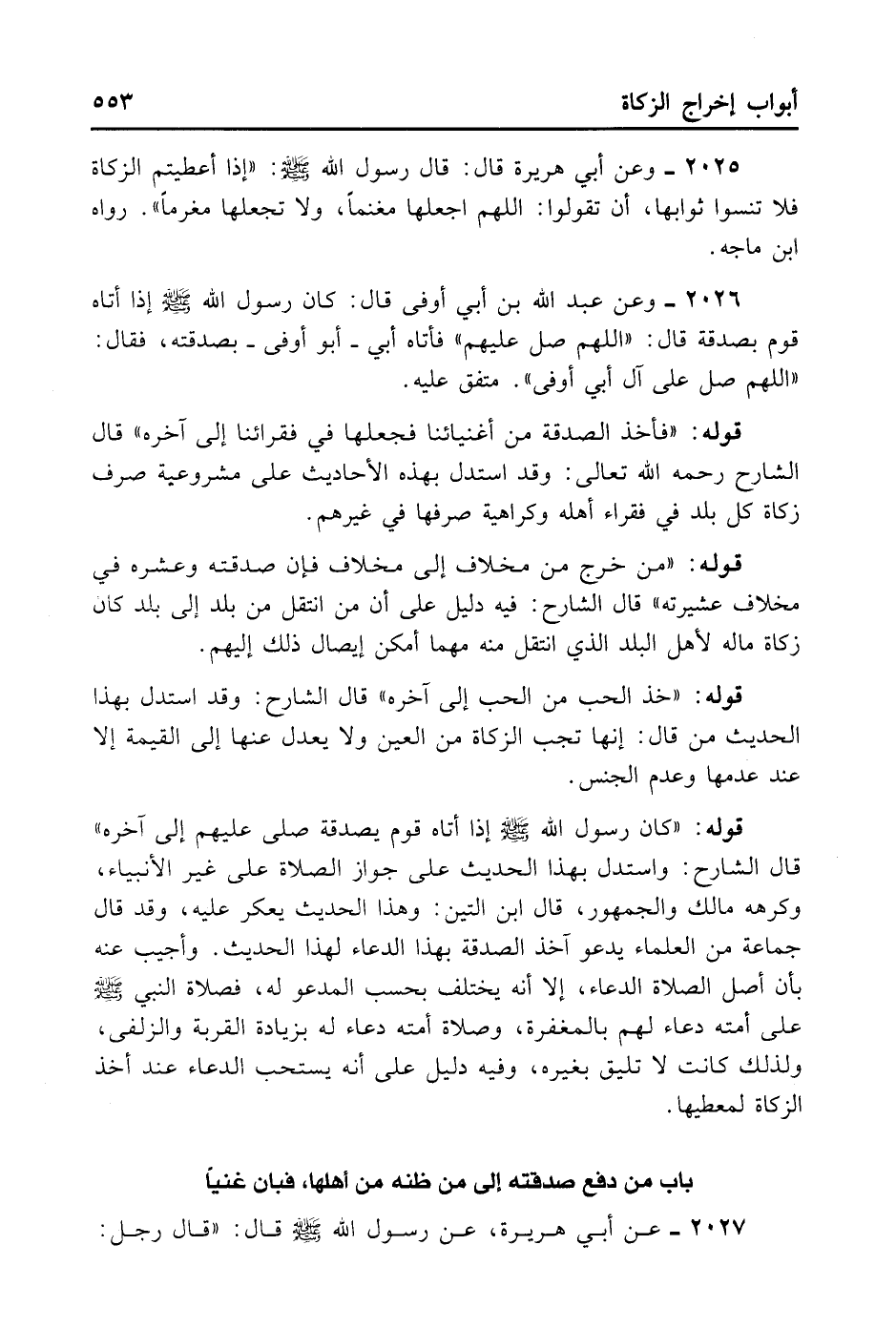 2026- وَعَنْ عَبْدِ اللَّهِ بْنِ أَبِي أَوْفَى قَالَ: كَانَ رَسُولُ اللَّهِ - صلى الله عليه وسلم - إذَا أَتَاهُ قَوْمٌ بِصَدَقَةٍ قَالَ: «اللَّهُمَّ صَلِّ عَلَيْهِمْ» . فَأَتَاهُ أَبِي أَبُو أَوْفَى بِصَدَقَتِهِ، فَقَالَ: ... «اللَّهُمَّ صَلِّ عَلَى آلِ أَبِي أَوْفَى» . مُتَّفَقٌ عَلَيْهِ.