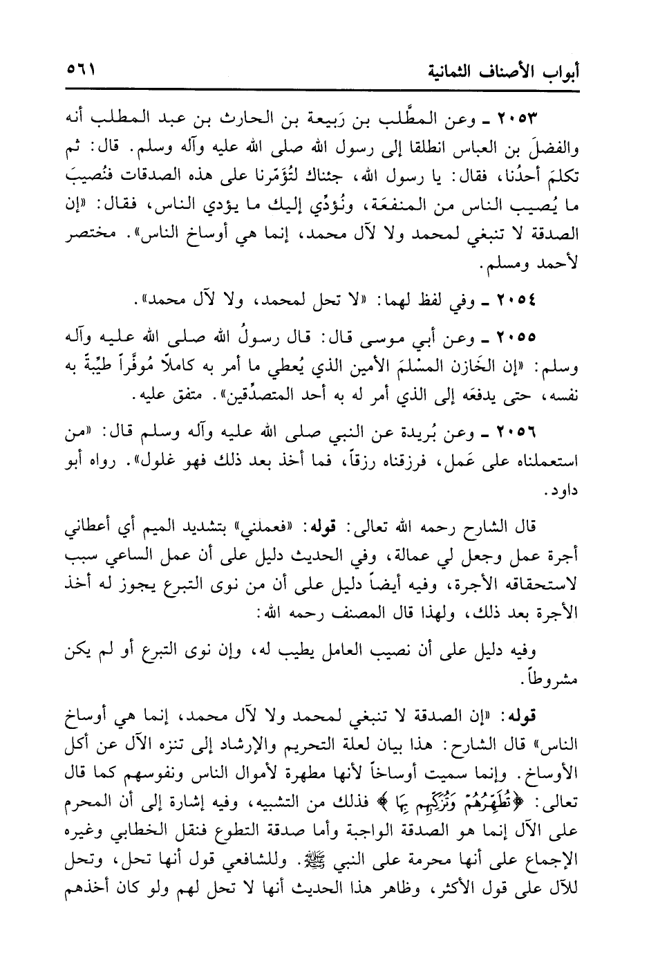 قَوْلُهُ: «إنَّ الصَّدَقَةَ لَا تَنْبَغِي لِمُحَمَّدٍ وَلَا لِآلِ مُحَمَّدٍ، إنَّمَا هِيَ أَوْسَاخُ النَّاسِ» . قَالَ الشَّارِحُ: هَذَا بَيَانٌ لَعِلَّةِ التَّحْرِيمِ وَالْإِرْشَادِ إلَى تَنَزُّهِ الْآلِ عَنْ أَكْلِ الْأَوْسَاخِ. وَإِنَّمَا سُمِّيَتْ أَوْسَاخًا لِأَنَّهَا مُطَهِّرَةٌ لِأَمْوَالِ النَّاسِ وَنُفُوسِهِمْ كَمَا قَالَ تَعَالَى: {تُطَهِّرُهُمْ وَتُزَكِّيهِمْ بِهَا} . فَذَلِكَ مِنْ التَّشْبِيهِ، وَفِيهِ إِشَارَة إلَى أَنَّ الْمُحَرَّمَ عَلَى الْآلِ إنَّمَا هُوَ الصَّدَقَةُ الْوَاجِبَةُ الَّتِي يَحْصُلُ بِهَا تَطْهِيرُ الْمَالِ. وَأَمَّا صَدَقَةُ التَّطَوُّعِ فَنَقَلَ الْخَطَّابِيِّ وَغَيْرُهُ الْإِجْمَاعَ عَلَى أَنَّهَا مُحَرَّمَةٌ عَلَى النَّبِيِّ - صلى الله عليه وسلم - وَلِلشَّافِعِيِّ قَوْلٌ أَنَّهَا تَحِلُّ، وَتَحِلُّ لِلْآلِ عَلَى قَوْلِ الْأَكْثَرِ، وَظَاهِرُ هَذَا الْحَدِيثِ أَنَّهَا لَا تَحِلُّ لَهُمْ وَلَوْ كَانَ أَخْذُهُمْ