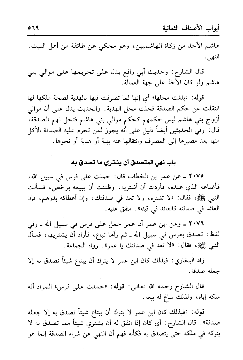 2075- عَنْ عُمَرَ بْنِ الْخَطَّابِ قَالَ: حَمَلْتُ عَلَى فَرَسٍ فِي سَبِيلِ اللَّهِ فَأَضَاعَهُ الَّذِي كَانَ عِنْدَهُ فَأَرَدْت أَنْ أَشْتَرِيَهُ وَظَنَنْتُ أَنَّهُ يَبِيعُهُ بِرَخْصٍ، فَسَأَلْتُ النَّبِيَّ - صلى الله عليه وسلم -، فَقَالَ: «لَا تَشْتَرِهِ، وَلَا تَعُدْ فِي صَدَقَتِكَ وَإِنْ أَعْطَاكَهُ بِدِرْهَمٍ، فَإِنَّ الْعَائِدَ فِي صَدَقَتِهِ كَالْعَائِدِ فِي قَيْئِهِ» . مُتَّفَقٌ عَلَيْهِ.