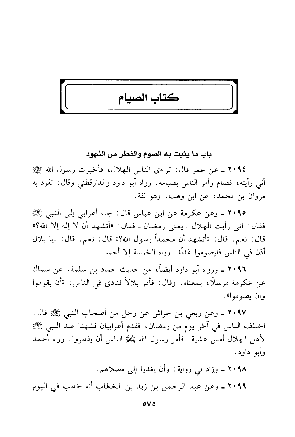 2094- عَنْ ابْنِ عُمَرَ قَالَ: تَرَاءَى النَّاسُ الْهِلَالَ فَأَخْبَرْتُ رَسُولَ اللَّهِ - صلى الله عليه وسلم - أَنِّي رَأَيْتُهُ فَصَامَ وَأَمَرَ النَّاسَ بِصِيَامِهِ. رَوَاهُ أَبُو دَاوُد وَالدَّارَقُطْنِيّ وَقَالَ: تَفَرَّدَ بِهِ مَرْوَانُ بْنُ مُحَمَّدٍ عَنْ ابْنِ وَهْبٍ وَهُوَ ثِقَةٌ.