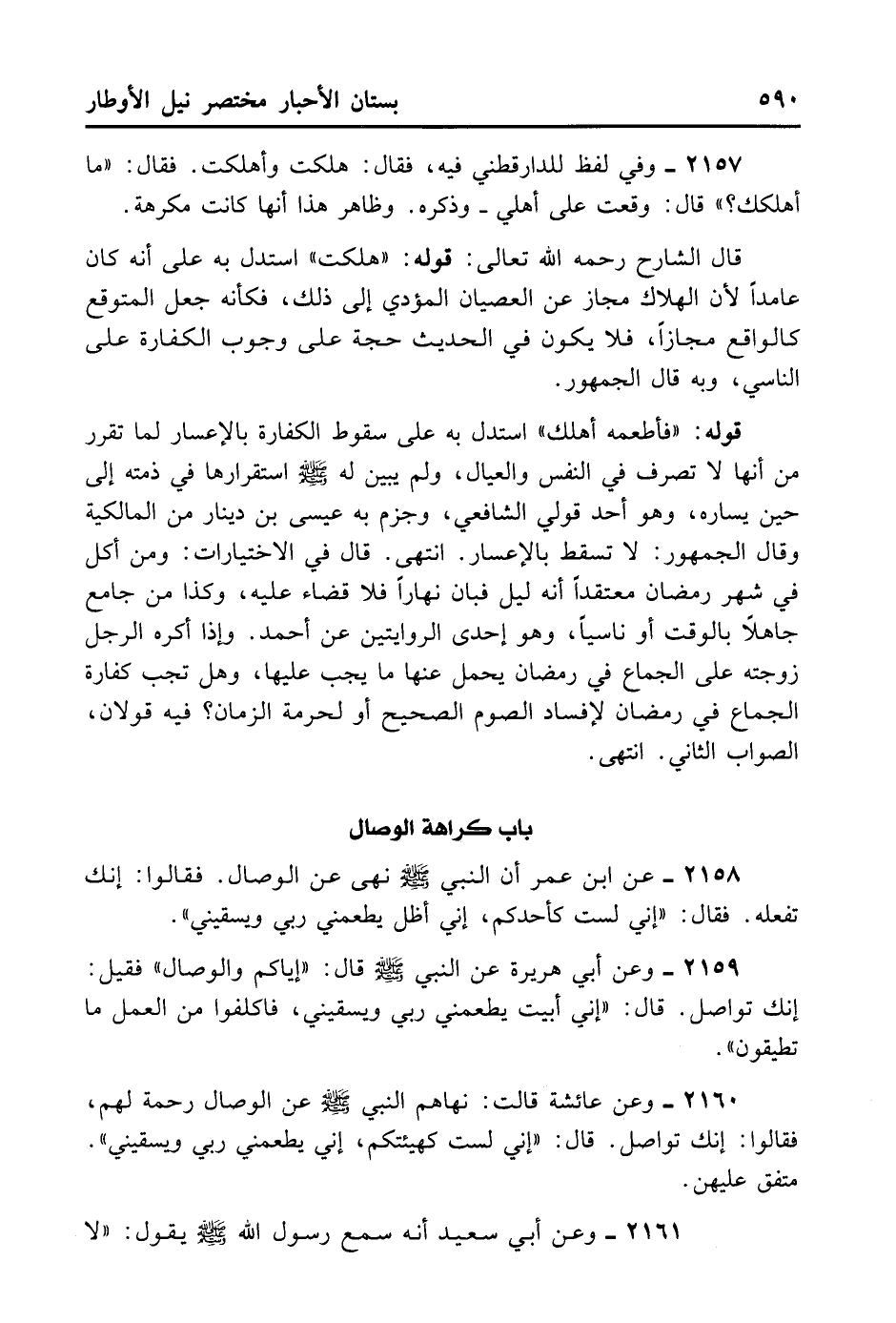 2160- وَعَنْ عَائِشَةَ قَالَتْ: نَهَاهُمْ النَّبِيُّ - صلى الله عليه وسلم - عَنْ الْوِصَالِ رَحْمَةً لَهُمْ، فَقَالُوا: إنَّكَ تُوَاصِلُ. فَقَالَ: «إنِّي لَسْتُ كَهَيْئَتِكُمْ إنِّي يُطْعِمُنِي رَبِّي وَيَسْقِينِي» . مُتَّفَقٌ عَلَيْهِنَّ.