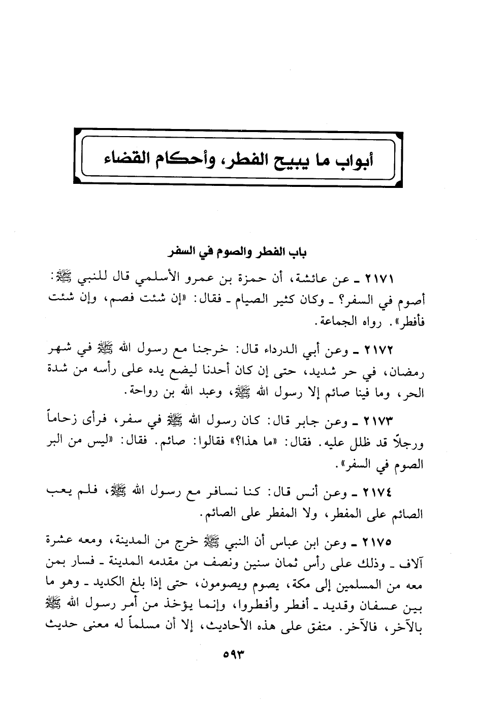 2174- وَعَنْ أَنَسٍ قَالَ: كُنَّا نُسَافِرُ مَعَ رَسُولِ اللَّهِ - صلى الله عليه وسلم - فَلَمْ يَعِبْ الصَّائِمُ عَلَى الْمُفْطِرِ، وَلَا الْمُفْطِرُ عَلَى الصَّائِمِ.