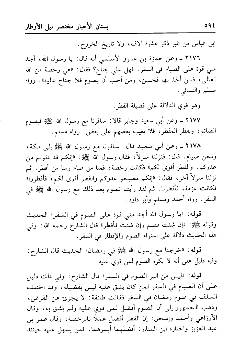 2176- وَعَنْ حَمْزَةَ بْنِ عَمْرٍو الْأَسْلَمِيِّ أَنَّهُ قَالَ: يَا رَسُولَ اللَّهِ أَجِدُ مِنِّي قُوَّةً عَلَى الصَّوْمِ فِي السَّفَرِ فَهَلْ عَلَيَّ جُنَاحٌ؟ فَقَالَ: «هِيَ رُخْصَةٌ مِنْ اللَّهِ