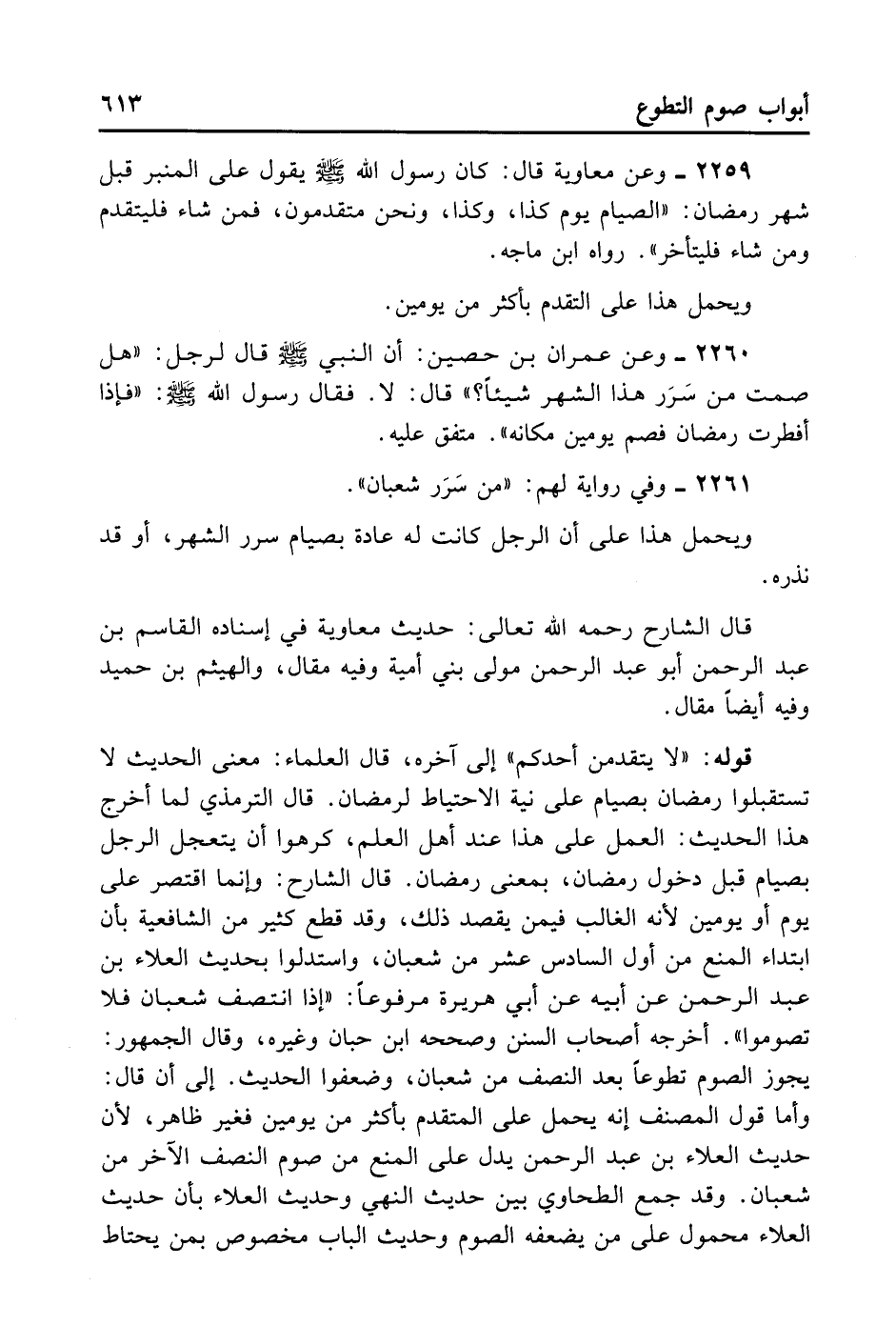 قَوْلُهُ: (لَا يَتَقَدَّمَنَّ أَحَدُكُمْ) إلَى آخِرِهِ. قَالَ الْعُلَمَاءُ: مَعْنَى الْحَدِيثِ: لَا تَسْتَقْبِلُوا رَمَضَانَ بِصِيَامٍ عَلَى نِيَّةِ الِاحْتِيَاطِ لِرَمَضَانَ. قَالَ التِّرْمِذِيُّ: لَمَّا أَخْرَجَ هَذَا الْحَدِيثُ الْعَمَلَ عَلَى هَذَا عِنْدَ أَهْلِ الْعِلْمِ كَرِهُوا أَنْ يَتَعَجَّلَ الرَّجُلُ بِصِيَامٍ قَبْلَ دُخُولِ رَمَضَانَ بِمَعْنَى رَمَضَانَ. قَالَ الشَّارِحُ: وَإِنَّمَا اقْتَصَرَ عَلَى يَوْمٍ أَوْ يَوْمَيْنِ لِأَنَّهُ الْغَالِبُ فِيمَنْ يَقْصِدُ ذَلِكَ. وَقَدْ قَطَعَ كَثِيرٌ مِنْ الشَّافِعِيَّةِ بِأَنَّ ابْتِدَاءَ الْمَنْعِ مِنْ أَوَّلِ السَّادِسِ عَشَرَ مِنْ شَعْبَانَ. وَاسْتَدَلُّوا بِحَدِيثِ الْعَلَاءِ بْنِ عَبْدِ الرَّحْمَنِ عَنْ أَبِيهِ عَنْ أَبِي هُرَيْرَةَ مَرْفُوعًا: «إذَا انْتَصَفَ شَعْبَانُ فَلَا تَصُومُوا» . أَخْرَجَهُ أَصْحَابُ السُّنَنِ وَصَحَّحَهُ ابْنُ حِبَّانَ وَغَيْرُهُ. وَقَالَ جُمْهُورُ الْعُلَمَاءِ: يَجُوزُ الصَّوْمُ تَطَوُّعًا بَعْدَ النِّصْفِ مِنْ شَعْبَانَ، وَضَعَّفُوا الْحَدِيثَ الْوَارِدَ. إِلِى أَنْ قَالَ: وَأَمَّا قَوْلُ الْمُصَنِّفِ: إنَّهُ يُحْمَلُ عَلَى الْمُتَقَدِّمِ بِأَكْثَرَ مِنْ يَوْمَيْنِ فَغَيْرُ ظَاهِرٍ؛ لِأَنَّ حَدِيثَ الْعَلَاءِ بْنِ عَبْدِ الرَّحْمَنِ الْمُتَقَدِّمَ يَدُلُّ عَلَى الْمَنْعِ مِنْ صَوْمِ النِّصْفِ الْآخَرِ مِنْ شَعْبَانَ. وَقَدْ جَمَعَ الطَّحَاوِيُّ بَيْنَ حَدِيثِ النَّهْيِ وَحَدِيثِ الْعَلَاءِ بِأَنَّ حَدِيثَ الْعَلَاءِ مَحْمُولٌ عَلَى مَنْ يُضْعِفُهُ الصَّوْمُ، وَحَدِيثُ الْبَابِ مَخْصُوصٌ بِمَنْ يَحْتَاطَ
