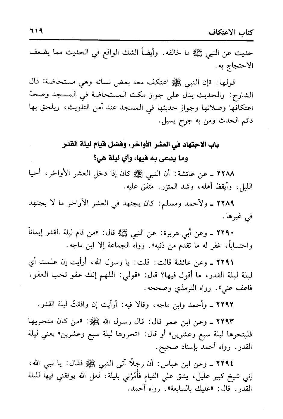 2288- عَنْ عَائِشَةَ أَنَّ النَّبِيَّ - صلى الله عليه وسلم - كَانَ إذَا دَخَلَ الْعَشْرُ الْأَوَاخِرُ أَحْيَا اللَّيْلَ وَأَيْقَظَ أَهْلَهُ وَشَدَّ الْمِئْزَرَ. مُتَّفَقٌ عَلَيْهِ.