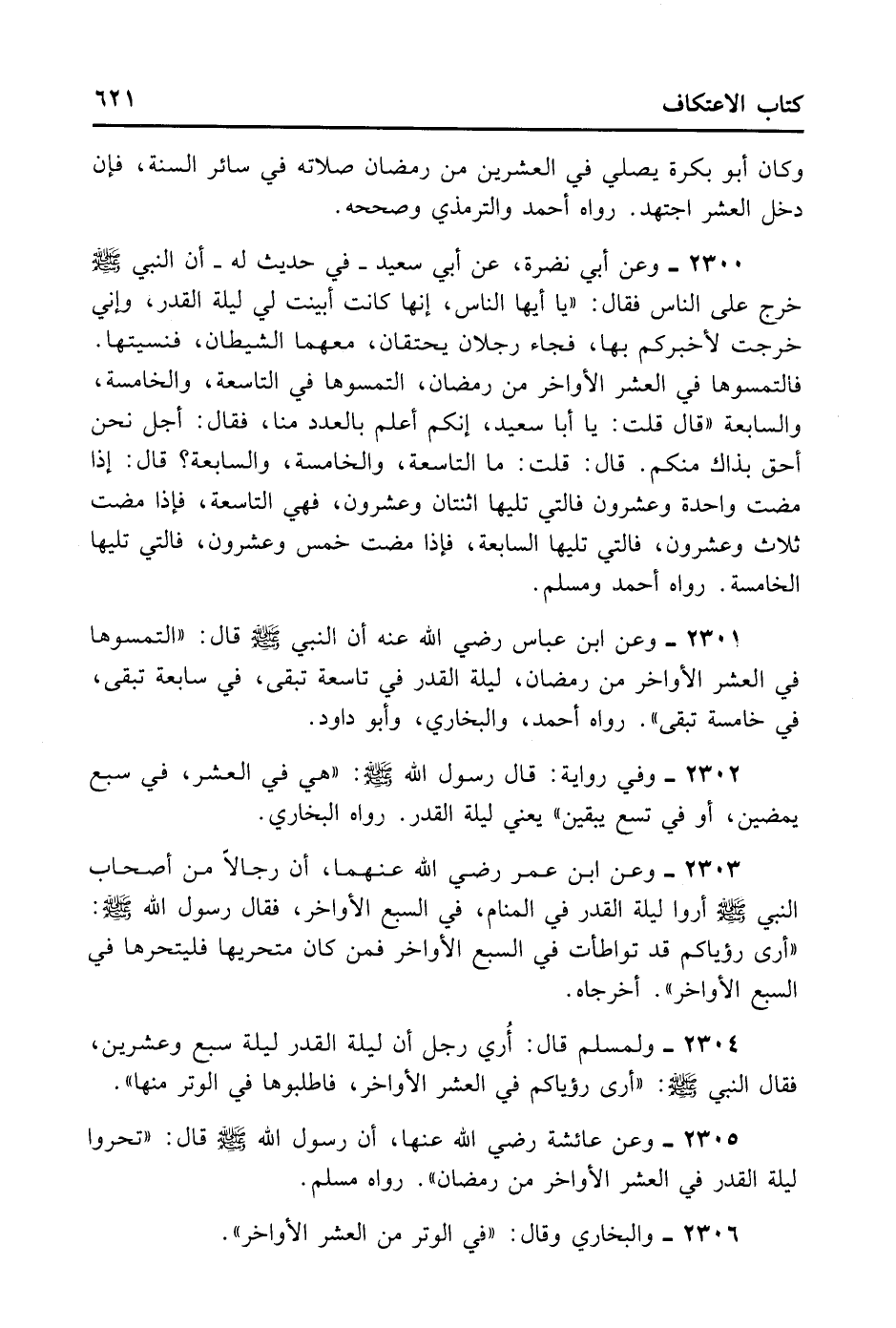 2301- وَعَنِ ابْنِ عَبَّاسٍ - رضي الله عنه - أَنْ النَّبِيِّ - صلى الله عليه وسلم - قَالَ: «الْتَمِسُوهَا فِي الْعَشْرِ الْأَوَاخِرِ مِنْ رَمَضَانَ لَيْلَة الْقَدْرِ فِي تَاسِعَةٍ تَبْقَى فِي سَابِعَةٍ تَبْقَى فِي خَامِسَةٍ تَبْقَى» . رَوَاهُ أَحْمَدٌ وَالْبُخَارِيُّ وَأَبُو دَاودٍ.