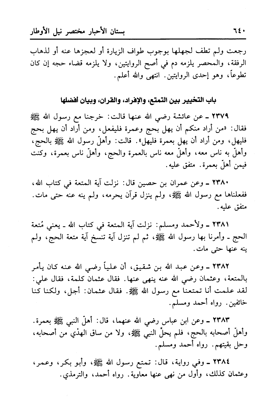 2381- وَلِأَحْمَدَ وَمُسْلِمٍ: وَنَزَلَتْ آيَةُ الْمُتْعَةِ فِي كِتَابِ اللَّهِ - يَعْنِي مُتْعَةَ الْحَجِّ - وَأَمَرَنَا بِهَا رَسُولُ اللَّهِ - صلى الله عليه وسلم -، ثُمَّ لَمْ تَنْزِلْ آيَةٌ تَنْسَخْ آيَةَ مُتْعَةِ الْحَجِّ وَلَمْ يَنْهَ عَنْهَا حَتَّى مَاتَ.