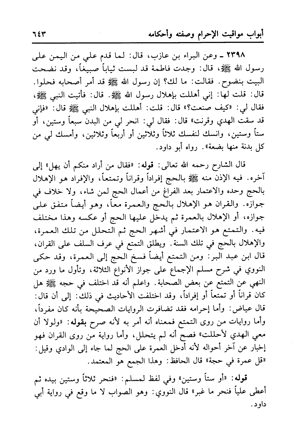 2398- وَعَنْ الْبَرَّاء بِن عَازَب قَالَ: لَمَّا قَدِمَ عَلي مِنَ الْيَمَنِ عَلَى ... رَسُولِ اللهِ - صلى الله عليه وسلم - قَالَ: وَجَدْتُ فَاطِمَةَ قَدْ لَبَسَتْ ثِيَابًا صَبِيغًا وَقَدْ نَضَحَتْ الْبَيْتَ بِنضُوح فَقَالَتْ: مَا لَكَ؟ إِنَّ رَسُولَ اللهِ - صلى الله عليه وسلم - قَدْ أَمَرَ أَصْحَابَهُ فَحَلُّوا. قَالَ: قُلْتْ لَهَا: إِنِّي أَهْلَلْتُ بِإِهْلالِ رَسُولِ اللهِ - صلى الله عليه وسلم - قَالَ: فَأَتَيْتُ النَّبِيَّ - صلى الله عليه وسلم - فَقَالَ لِي: «كَيْفَ صَنَعْتُ» ؟ قَالَ: قُلْتُ: أَهْلَلْتُ بِإِهْلالِ النَّبِيِّ - صلى الله عليه وسلم - قَالَ: «فَإِنِّي قَدْ