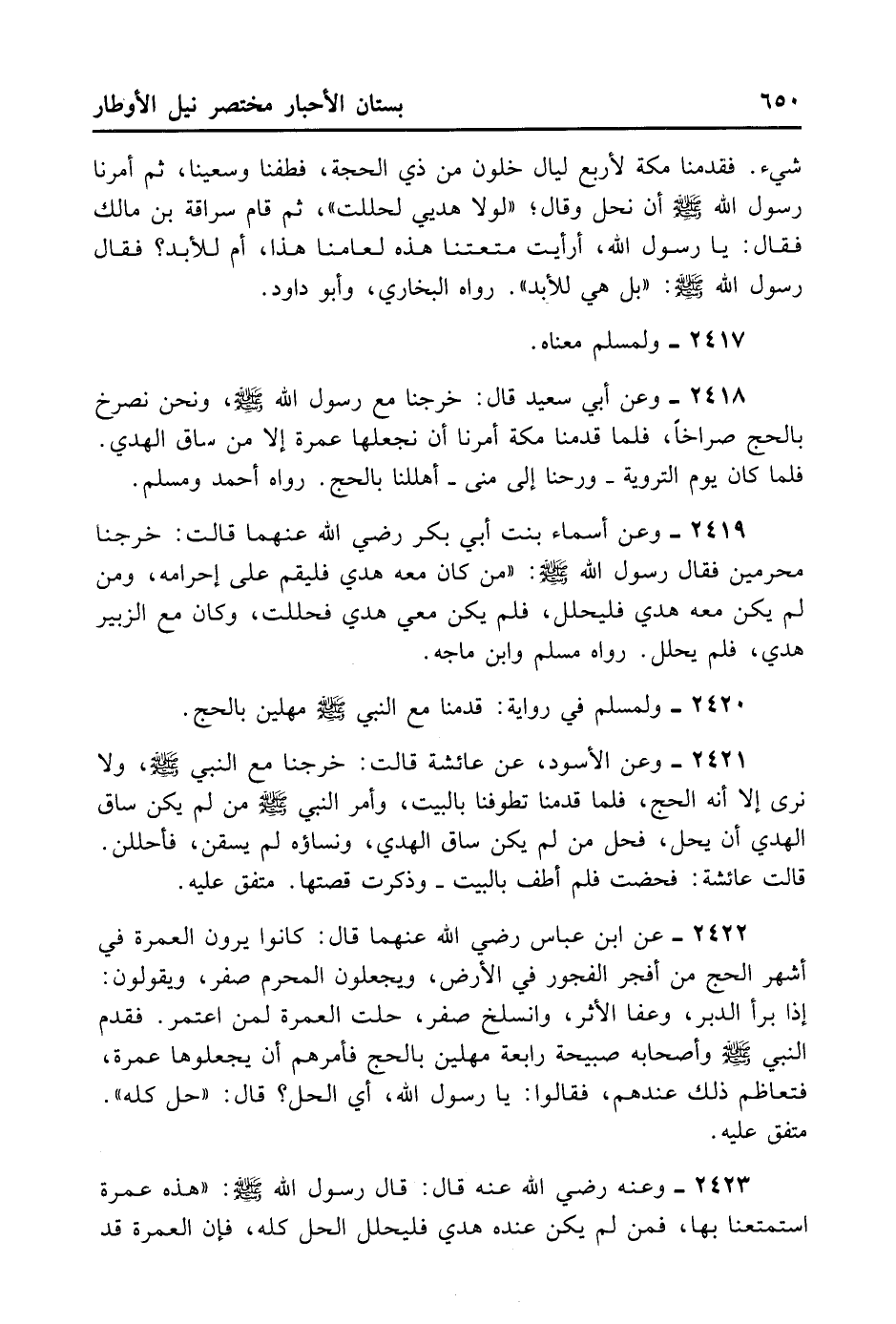 2423- وَعَنْهُ - رضي الله عنه - قَالَ: قَالَ رَسُولُ اللهِ - صلى الله عليه وسلم -: «هَذِهِ عُمْرَة اسْتَمْتَعْنَا بِهَا فَمَنْ لَمْ يَكُنْ عِنْدَهُ هَدْي فَلْيُحْلِل الْحِلَّ كُلَّه فَإِنَّ الْعُمْرَةْ قَدْ