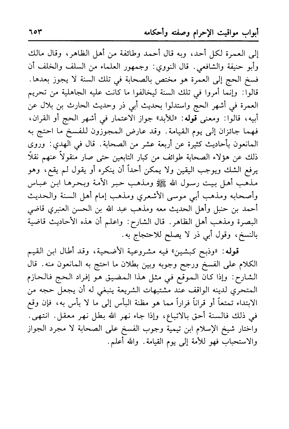 إلَى الْعُمْرَةِ لِكُلِّ أَحَدٍ. وَبِهِ قَالَ أَحْمَدُ وَطَائِفَةٌ مِنْ أَهْلِ الظَّاهِرِ. وَقَالَ مَالِكٌ وَأَبُو حَنِيفَةَ وَالشَّافِعِيُّ. قَالَ النَّوَوِيُّ وَجُمْهُورُ الْعُلَمَاءِ مِنْ السَّلَفِ وَالْخَلَفِ: إنَّ فَسْخَ الْحَجِّ إلَى الْعُمْرَةِ هُوَ مُخْتَصٌّ بِالصَّحَابَةِ فِي تِلْكَ السَّنَةِ لَا يَجُوزُ بَعْدَهَا، قَالُوا: وَإِنَّمَا أُمِرُوا بِهِ فِي تِلْكَ السَّنَةِ لَيُخَالِفُوا مَا كَانَتْ عَلَيْهِ الْجَاهِلِيَّةُ مِنْ تَحْرِيمِ الْعُمْرَةِ فِي أَشْهُرِ الْحَجِّ وَاسْتَدَلُّوا بِحَدِيثِ أَبِي ذَرٍّ وَحَدِيثِ الْحَارِثِ بْنِ بِلَالٍ عَنْ أَبِيهِ وَسَيَأْتِيَانِ وَيَأْتِي الْجَوَابُ عَنْهُمَا. قَالُوا: وَمَعْنَى قَوْلِهِ: «لِلْأَبَدِ» جَوَازُ الِاعْتِمَارِ فِي أَشْهُرِ الْحَجِّ أَوْ الْقِرَانِ فَهُمَا جَائِزَانِ إلَى يَوْمِ الْقِيَامَةِ. وَقَدْ عَارَضَ الْمُجَوِّزُونَ لِلْفَسْخِ مَا احْتَجَّ بِهِ الْمَانِعُونَ بِأَحَادِيثَ كَثِيرَةٍ عَنْ أَرْبَعَةَ عَشَرَ مِنْ الصَّحَابَةِ. قَالَ فِي الْهَدْيِ: وَرَوَى ذَلِكَ عَنْ هَؤُلَاءِ الصَّحَابَةِ طَوَائِفُ مِنْ كِبَارِ التَّابِعِينَ، حَتَّى صَارَ مَنْقُولًا عَنْهُمْ نَقْلًا يَرْفَعُ الشَّكَّ وَيُوجِبُ الْيَقِينَ وَلَا يُمَكِّنُ أَحَدًا أَنْ يُنْكِرَهُ أَوْ يَقُولَ لَمْ يَقَعْ، وَهُوَ مَذْهَبُ أَهْلِ بَيْتِ رَسُولِ اللَّهِ - صلى الله عليه وسلم - وَمَذْهَبُ حَبْرِ الْأُمَّةِ وَبَحْرِهَا ابْنِ عَبَّاسٍ وَأَصْحَابِهِ وَمَذْهَبُ أَبِي مُوسَى الْأَشْعَرِيِّ وَمَذْهَبُ إمَامِ أَهْلِ السُّنَّةِ وَالْحَدِيثِ أَحْمَدَ بْنِ حَنْبَلٍ وَأَهْلِ الْحَدِيثِ مَعَهُ وَمَذْهَبُ عَبْدِ اللَّهِ بْنِ الْحَسَنِ الْعَنْبَرِيِّ قَاضِي الْبَصْرَةِ وَمَذْهَبُ أَهْلِ الظَّاهِرِ. قَالَ الشَّارِحُ: وَاعْلَمْ أَنَّ هَذِهِ الْأَحَادِيثَ قَاضِيَةٌ بِالنََّسْخِ، وَقَوْلُ أَبِي ذَرٍّ لَا يَصْلُحُ لِلِاحْتِجَاجِ بِهِ.