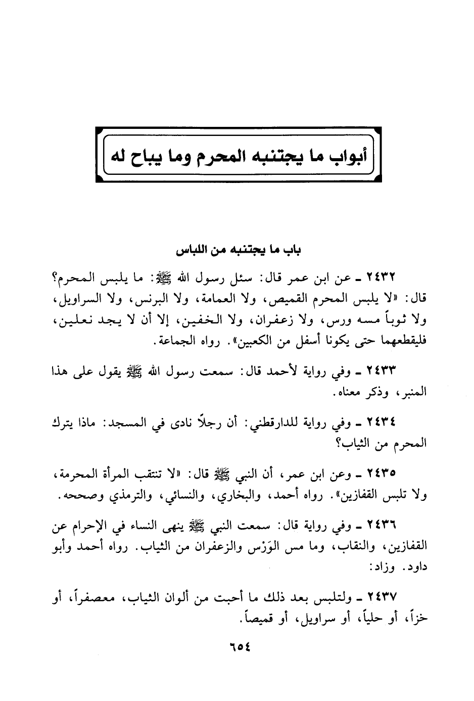 2432- عَنْ ابْنِ عُمَرَ قَالَ: سُئِلَ رَسُولُ اللَّهِ - صلى الله عليه وسلم - مَا يَلْبَسُ الْمُحْرِمُ؟ قَالَ: «لَا يَلْبَسُ الْمُحْرِمُ الْقَمِيصَ، وَلَا الْعِمَامَةَ، وَلَا الْبُرْنُسَ، وَلَا السَّرَاوِيلَ وَلَا ثَوْبًا مَسَّهُ وَرْسٌ، وَلَا زَعْفَرَانٌ، وَلَا الْخُفَّيْنِ إلَّا أَنْ لَا يَجِدَ نَعْلَيْنِ فَلْيَقْطَعْهُمَا حَتَّى يَكُونَا أَسْفَلَ مِنْ الْكَعْبَيْنِ» . رَوَاهُ الْجَمَاعَةُ.