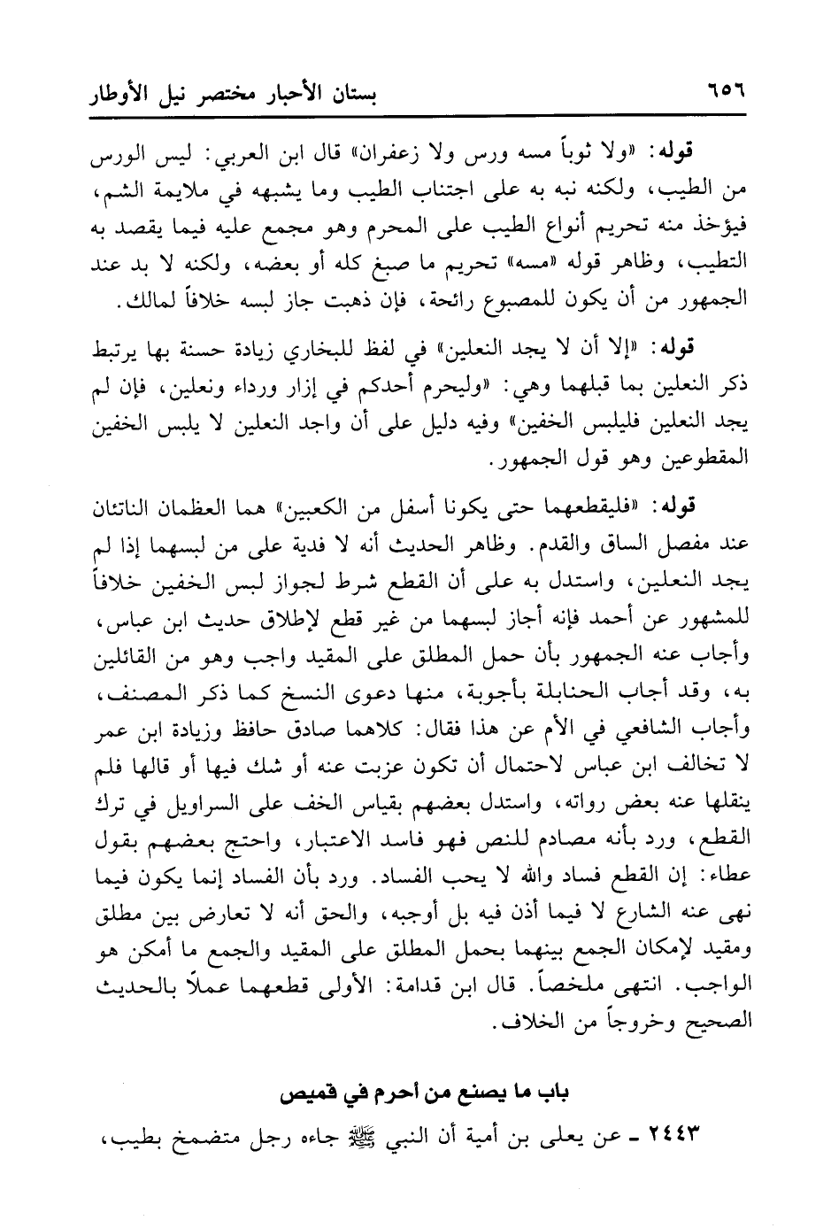 قَوْلُهُ: (فَلْيَقْطَعْهُمَا حَتَّى يَكُونَا أَسْفَلَ مِنْ الْكَعْبَيْنِ) . هُمَا الْعَظْمَانِ النَّاتِئَانِ عِنْدَ مِفْصَلِ السَّاقِ وَالْقَدَمِ. وَظَاهِرُ الْحَدِيثِ أَنَّهُ لَا فِدْيَةَ عَلَى مَنْ لَبِسَهُمَا إذَا لَمْ يَجِدْ النَّعْلَيْنِ. وَاسْتَدَلَّ بِهِ عَلَى أَنَّ الْقَطْعَ شَرْطٌ لِجَوَازِ لُبْسِ الْخُفَّيْنِ خِلَافًا لِلْمَشْهُورِ عَنْ أَحْمَدَ فَإِنَّهُ أَجَازَ لُبْسَهُمَا مِنْ غَيْرِ قَطْعٍ لإِطْلَاقِ حَدِيثِ ابْنِ عَبَّاسٍ، وَأَجَابَ عَنْهُ الْجُمْهُورُ بِأَنَّ حَمْلَ الْمُطْلَقِ عَلَى الْمُقَيَّدِ وَاجِبٌ وَهُوَ مِنْ الْقَائِلِينَ بِهِ. وَقَدْ أَجَابَ الْحَنَابِلَةُ بِأَجْوِبَةٍ مِنْهَا دَعْوَى النَّسْخِ كَمَا ذَكَرَ الْمُصَنِّفُ. وَأَجَابَ الشَّافِعِيُّ فِي الْأُمِّ عَنْ هَذَا فَقَالَ: كِلَاهُمَا صَادِقٌ حَافِظٌ، وَزِيَادَةُ ابْنِ عُمَرَ لَا تُخَالِفُ ابْنَ عَبَّاسٍ لِاحْتِمَالِ أَنْ تَكُونَ عَزَبَتْ عَنْهُ أَوْ شَكَّ فِيهَا أَوْ قَالَهَا فَلَمْ يَنْقُلْهَا عَنْهُ بَعْضُ رُوَاتِهِ. وَاسْتَدَلَّ بَعْضُهُمْ بِقِيَاسِ الْخُفِّ عَلَى السَّرَاوِيلِ فِي تَرْكِ الْقَطْعِ، وَرُدَّ بِأَنَّهُ مُصَادِمٌ لِلنَّصِّ فَهُوَ فَاسِدُ الِاعْتِبَارِ، وَاحْتَجَّ بَعْضُهُمْ بِقَوْلِ عَطَاءٍ: إنَّ الْقَطْعَ فَسَادٌ، وَاَللَّهُ لَا يُحِبُّ الْفَسَادَ، وَرُدَّ بِأَنَّ الْفَسَادَ إنَّمَا يَكُونُ