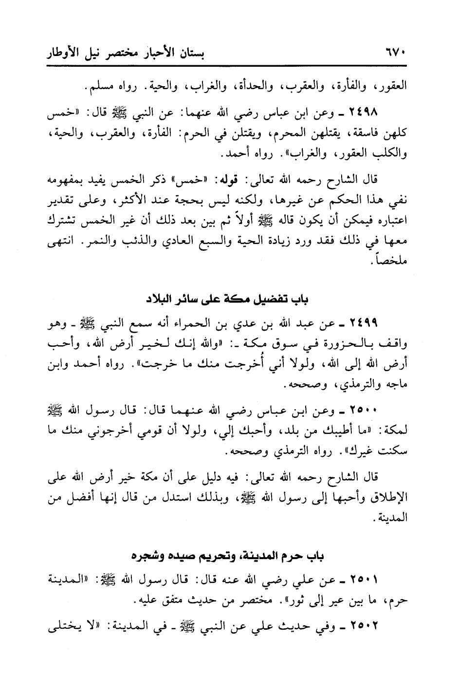 2498- وَعَنْ ابْنِ عَبَّاسٍ رَضِيَ اللهُ عَنْهُمَا عَنْ النَّبِيِّ - صلى الله عليه وسلم - قَالَ: «خَمْسٌ كُلُّهُنَّ فَاسِقَةٌ يَقْتُلُهُنَّ الْمُحْرِمُ وَيُقْتَلْنَ فِي الْحَرَمِ: الْفَأْرَةُ، وَالْعَقْرَبُ، وَالْحَيَّةُ وَالْكَلْبُ الْعَقُورُ، وَالْغُرَابُ» . رَوَاهُ أَحْمَدُ.