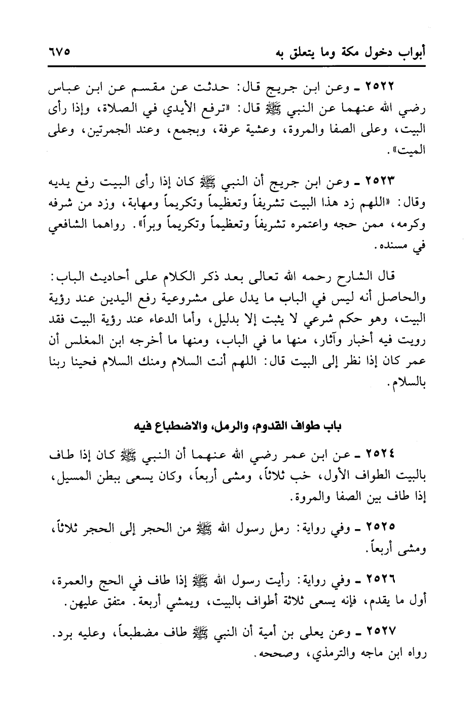 قَالَ الشَّارِحُ رَحِمَهُ اللَّهُ تَعَالَى بَعَدَ ذِكْرِ أَحَادِيِثِ الْبَابِ: وَالْحَاصِلُ أَنَّهُ لَيْسَ فِي الْبَابِ مَا يَدُلُّ عَلَى مَشْرُوعِيَّة رَفْعِ الْيَدَيْنِ عِنْدَ رُؤْيَةِ الْبَيْتِ وَهُوَ حُكْمٌ شَرْعِيٌّ لَا يَثْبُتُ إلَّا بِدَلِيلٍ. وَأَمَّا الدُّعَاءُ عِنْدَ رُؤْيَةِ الْبَيْتِ فَقَدْ رُوِيَتْ فِيهِ أَخْبَارٌ وَآثَارٌ مِنْهَا مَا فِي الْبَابِ، وَمِنْهَا مَا أَخْرَجَهُ ابْنُ الْمُغْلِسِ أَنَّ عُمَرَ كَانَ إذَا نَظَرَ إلَى الْبَيْتِ قَالَ: اللَّهُمَّ أَنْتَ السَّلَامُ وَمِنْكَ السَّلَامُ فَحَيِّنَا رَبَّنَا بِالسَّلَامِ.