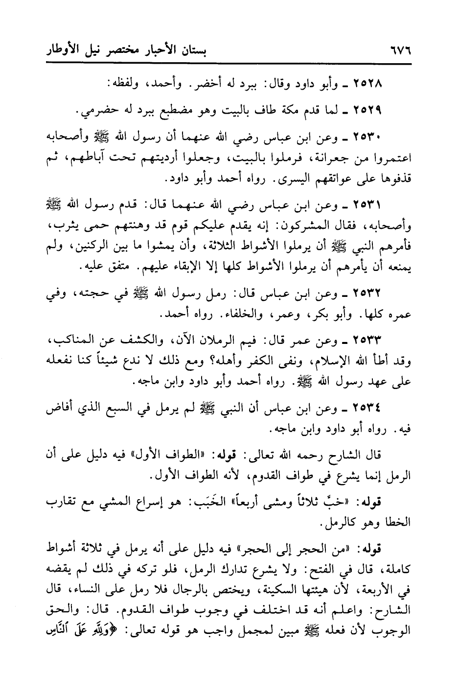 2530- وَعَنْ ابْنِ عَبَّاسٍ رَضِيَ اللهُ عَنْهُمَا أَنَّ رَسُولَ اللَّهِ - صلى الله عليه وسلم - وَأَصْحَابَهُ اعْتَمَرُوا مِنْ جِعْرَانَةَ فَرَمَلُوا بِالْبَيْتِ وَجَعَلُوا أَرْدِيَتَهُمْ تَحْتَ آبَاطِهِمْ، ثُمَّ قَذَفُوهَا عَلَى عَوَاتِقِهِمْ الْيُسْرَى. رَوَاهُ أَحْمَدُ وَأَبُو دَاوُد.