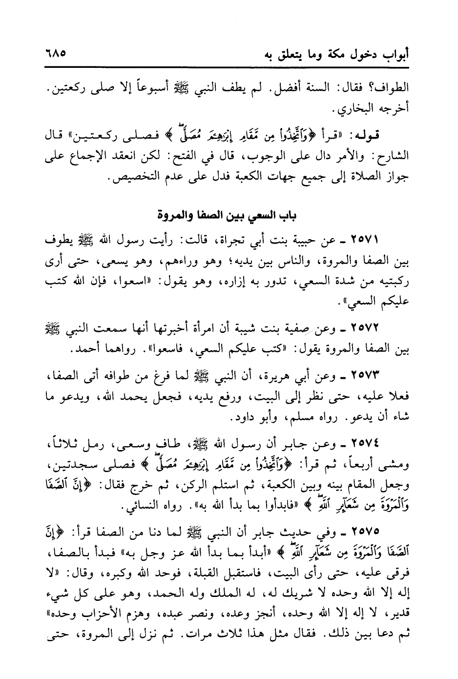 2574- وَعَنْ جَابِرٍ أَنَّ رَسُولَ اللَّهِ - صلى الله عليه وسلم - طَافَ وَسَعَى، رَمَلَ ثَلَاثًا، وَمَشَى أَرْبَعًا، ثُمَّ قَرَأَ: {وَاِتَّخِذُوا مِنْ مَقَامِ إبْرَاهِيمَ مُصَلًّى} . فَصَلَّى سَجْدَتَيْنِ، وَجَعَلَ الْمَقَامَ بَيْنَهُ وَبَيْنَ الْكَعْبَةِ، ثُمَّ اسْتَلَمَ الرُّكْنَ، ثُمَّ خَرَجَ فَقَالَ: « {إنَّ الصَّفَا وَالْمَرْوَةَ مِنْ شَعَائِرِ اللَّهِ} ، فَابْدَءُوا بِمَا بَدَأَ اللَّهُ بِهِ» . رَوَاهُ النَّسَائِيّ.