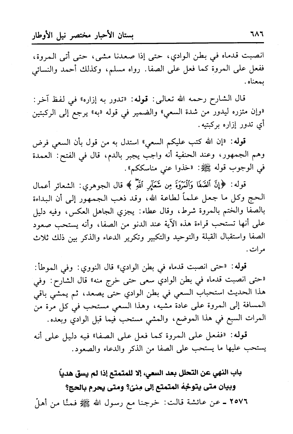 بَطْنِ الْوَادِي حَتَّى إذَا صَعِدْنَا مَشَى حَتَّى أَتَى الْمَرْوَةَ فَفَعَلَ عَلَى الْمَرْوَةِ كَمَا فَعَلَ عَلَى الصَّفَا. رَوَاهُ مُسْلِمٌ. وَكَذَلِكَ أَحْمَدُ وَالنَّسَائِيُّ بِمَعْنَاهُ.