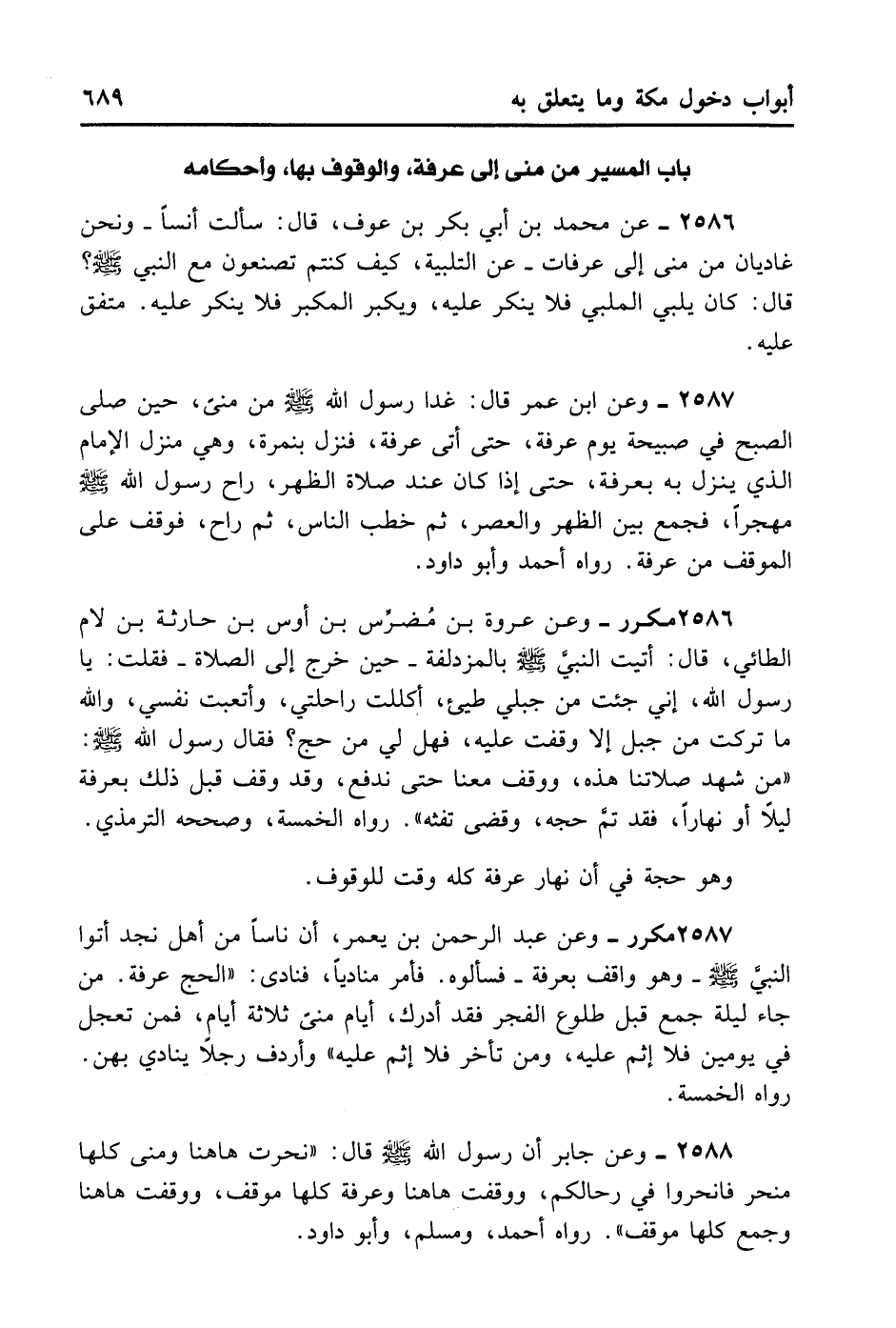 2586- عَنْ مُحَمَّدِ بْنِ أَبِي بَكْرِ بْنِ عَوْفٍ قَالَ: سَأَلْتُ أَنَسًا وَنَحْنُ غَادِيَانِ مِنْ مِنًى إلَى عَرَفَاتٍ عَنْ التَّلْبِيَةِ كَيْفَ كُنْتُمْ تَصْنَعُونَ مَعَ النَّبِيِّ - صلى الله عليه وسلم -؟ قَالَ: كَانَ يُلَبِّي الْمُلَبِّي فَلَا يُنْكَرُ عَلَيْهِ، وَيُكَبِّرُ الْمُكَبِّرُ فَلَا يُنْكَرُ عَلَيْهِ. مُتَّفَقٌ عَلَيْهِ.