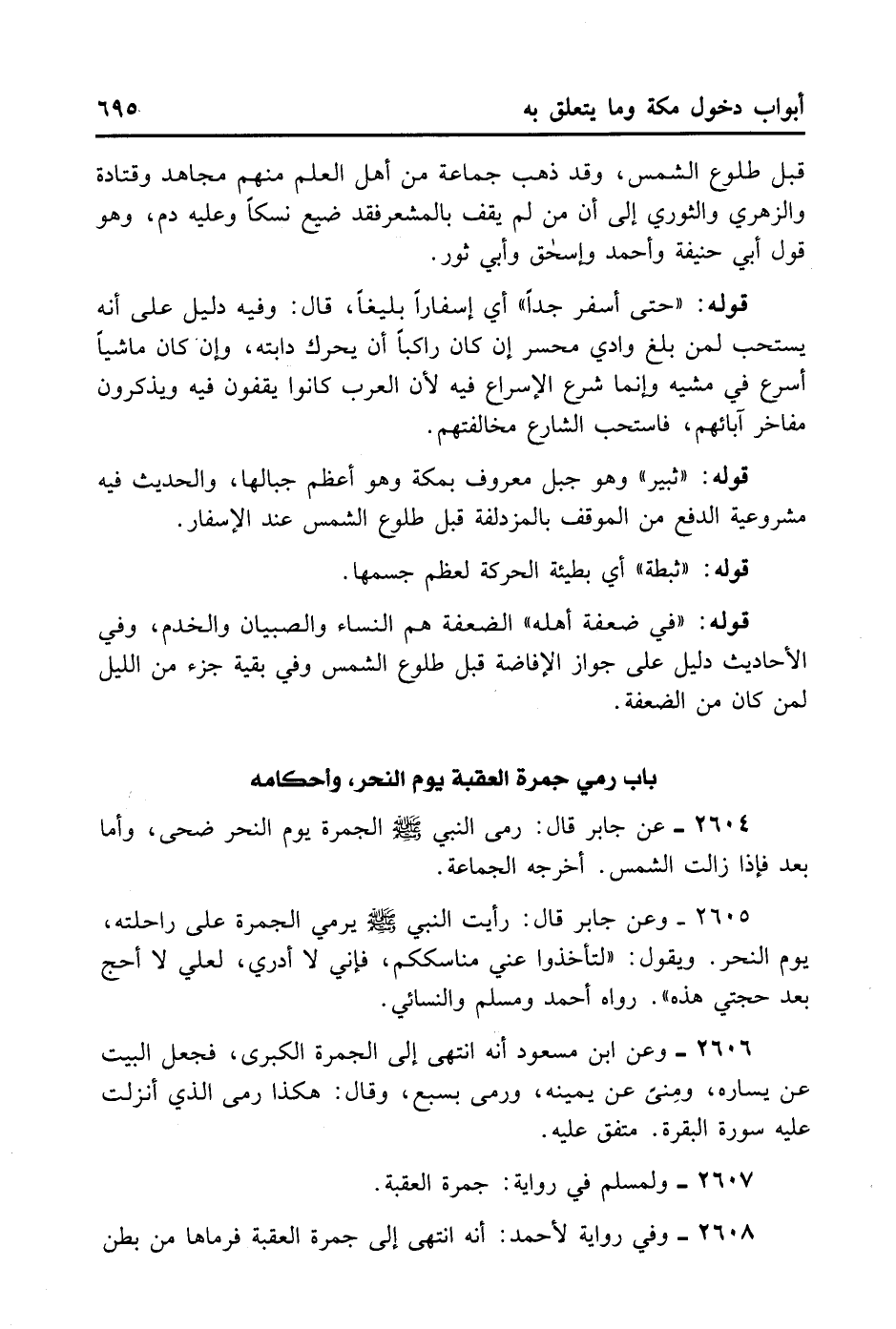 2605- وَعَنْ جَابِرٍ قَالَ: رَأَيْتُ النَّبِيَّ - صلى الله عليه وسلم - يَرْمِي الْجَمْرَةَ عَلَى رَاحِلَتِهِ يَوْمَ النَّحْرِ وَيَقُولُ: لِتَأْخُذُوا عَنِّي مَنَاسِكَكُمْ فَإِنِّي لَا أَدْرِي لَعَلِّي لَا أَحُجُّ بَعْدَ حَجَّتَيْ هَذِهِ. رَوَاهُ أَحْمَدُ وَمُسْلِمٌ وَالنَّسَائِيُّ.