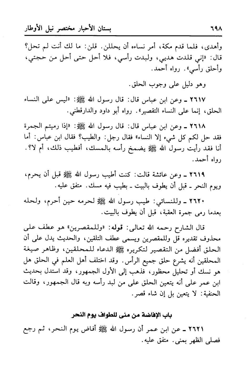 2617- وَعَنْ ابْنِ عَبَّاسٍ قَالَ: قَالَ رَسُولُ اللَّهِ - صلى الله عليه وسلم -: «لَيْسَ عَلَى النِّسَاءِ الْحَلْقُ إنَّمَا عَلَى النِّسَاءِ التَّقْصِيرُ» . رَوَاهُ أَبُو دَاوُد وَالدَّارَقُطْنِيّ.
