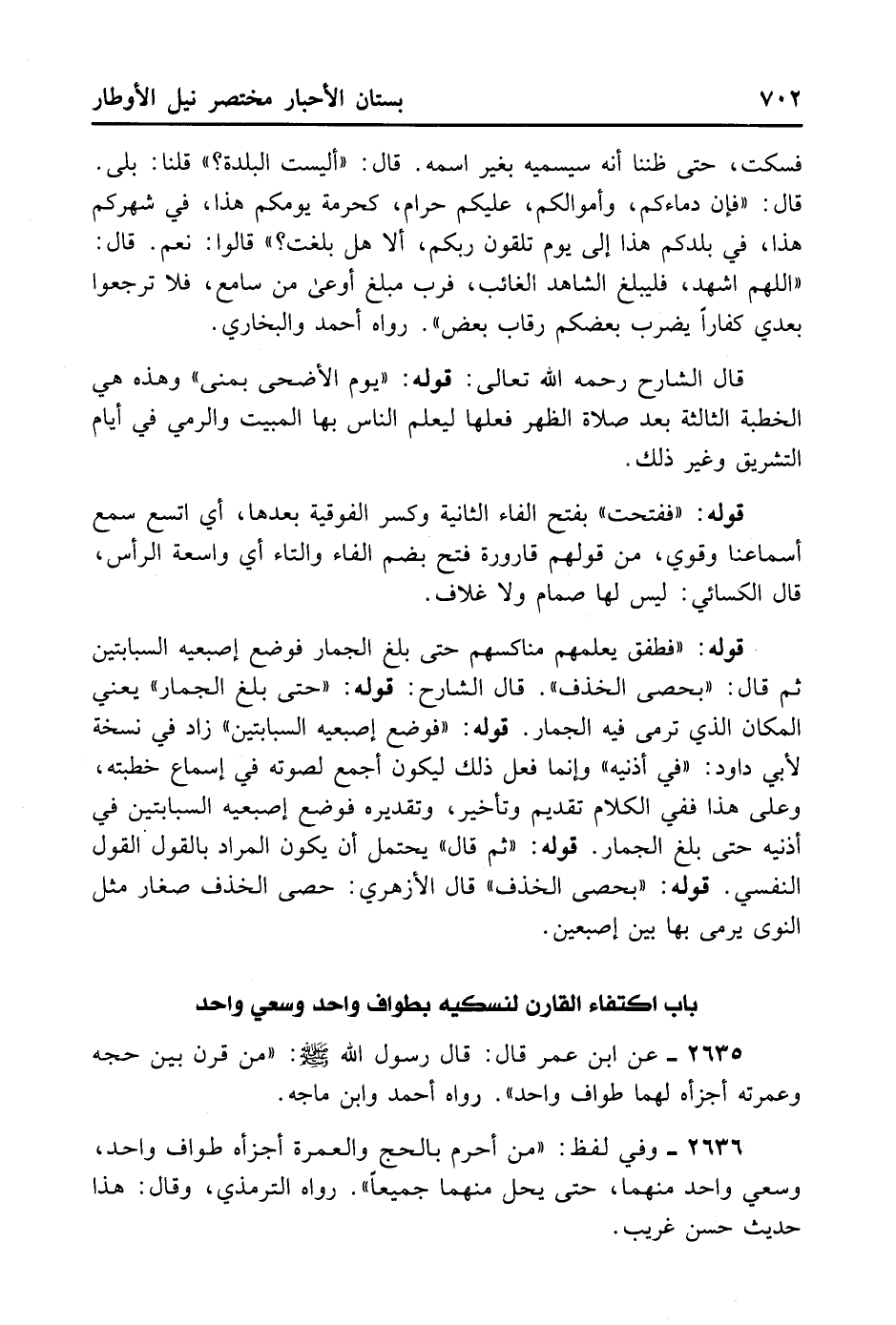 فَسَكَتَ حَتَّى ظَنَنَّا أَنَّهُ سَيُسَمِّيهِ بِغَيْرِ اسْمِهِ، قَالَ: «أَلَيْسَتْ الْبَلْدَةُ» ؟ قُلْنَا: بَلَى، قَالَ: «فَإِنَّ دِمَاءَكُمْ وَأَمْوَالَكُمْ عَلَيْكُمْ حَرَامٌ كَحُرْمَةِ يَوْمِكُمْ هَذَا، فِي شَهْرِكُمْ هَذَا، فِي بَلَدِكُمْ هَذَا إلَى يَوْمِ تَلْقَوْنَ رَبَّكُمْ، أَلَا هَلْ بَلَّغْتُ» ؟ قَالُوا: نَعَمْ، قَالَ: «اللَّهُمَّ اشْهَدْ فَلْيُبَلِّغْ الشَّاهِدُ الْغَائِبَ، فَرُبَّ مُبَلَّغٍ أَوْعَى مِنْ سَامِعٍ، فَلَا تَرْجِعُوا بَعْدِي كُفَّارًا يَضْرِبُ بَعْضُكُمْ رِقَابَ بَعْضٍ» . رَوَاهُ أَحْمَدُ وَالْبُخَارِيُّ.