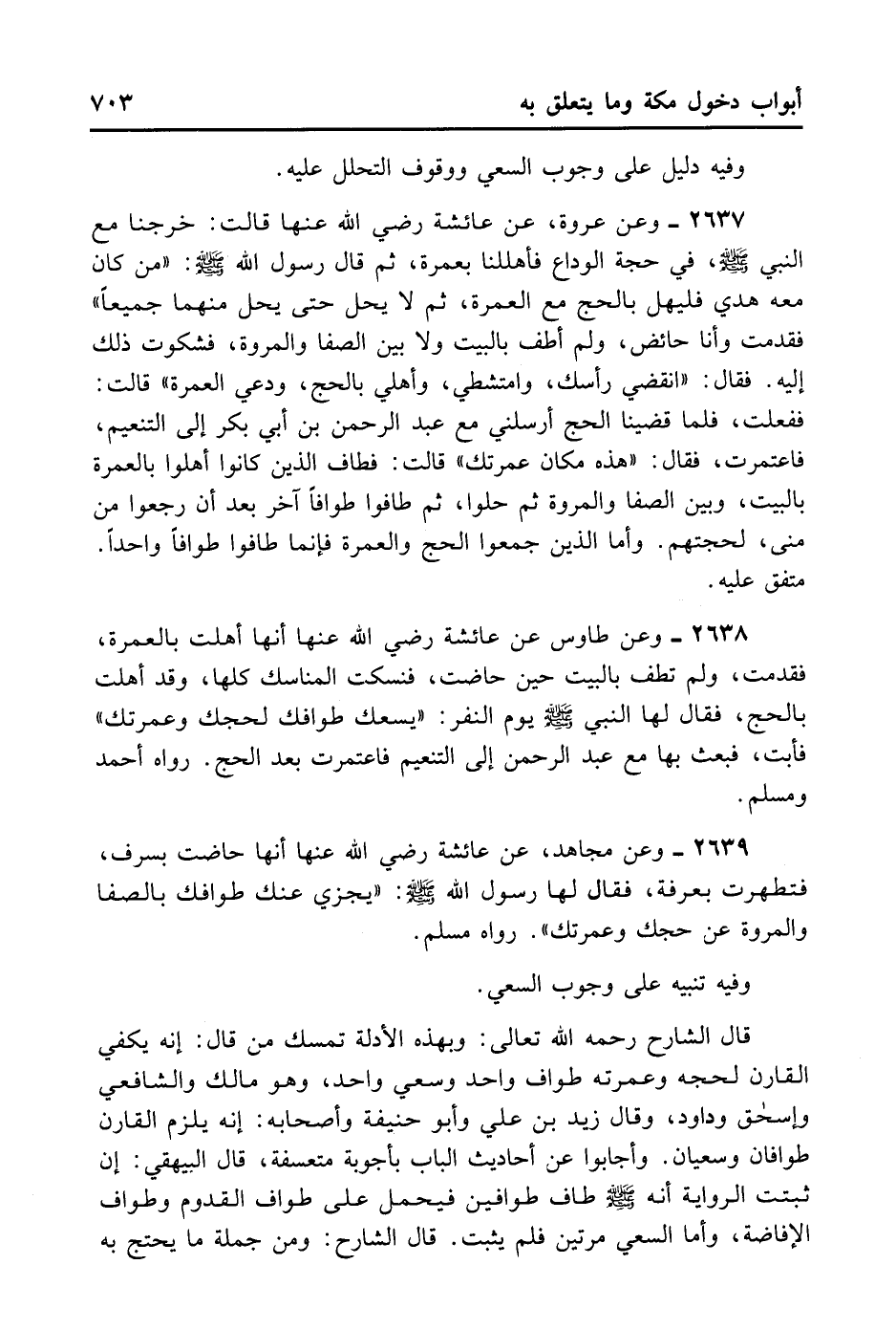 2639- وَعَنْ مُجَاهِدٍ عَنْ عَائِشَةَ رَضِيَ اللهُ عَنْهَا أَنَّهَا حَاضَتْ بِسَرِفٍ، فَتَطَهَّرَتْ بِعَرَفَةَ، فَقَالَ لَهَا رَسُولُ اللَّهِ - صلى الله عليه وسلم -: «يُجْزِي عَنْكِ طَوَافُكِ بِالصَّفَا وَالْمَرْوَةِ عَنْ حَجِّكِ وَعُمْرَتِكِ» . رَوَاهُ مُسْلِمٌ.