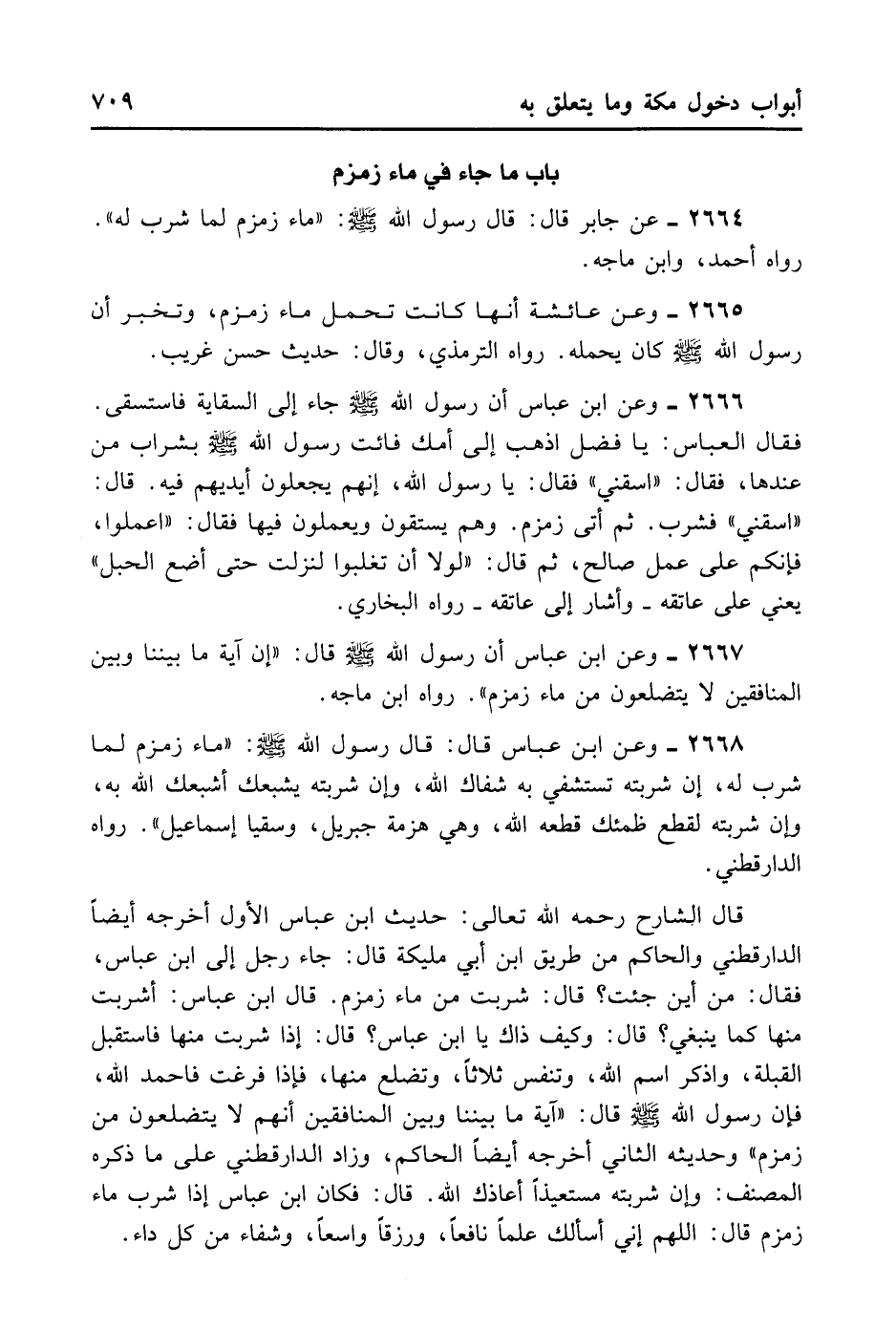 قَالَ الشَّارِحُ رَحِمَهُ اللَّهُ تَعَالَى: وَحَدِيثُ ابْنِ عَبَّاسٍ الْأَوَّلُ أَخْرَجَهُ أَيْضًا الدَّارَقُطْنِيّ وَالْحَاكِمُ مِنْ طَرِيقِ ابْنِ أَبِي مُلَيْكَةَ قَالَ: جَاءَ رَجُلٌ إلَى ابْنِ عَبَّاسٍ فَقَالَ: مِنْ أَيْنَ جِئْتَ قَالَ: شَرِبْتُ مِنْ مَاءِ زَمْزَمَ. قَالَ ابْنُ عَبَّاسٍ أَشَرِبْتَ مِنْهَا كَمَا يَنْبَغِي قَالَ: وَكَيْفَ ذَاكَ يَا ابْنَ عَبَّاسٍ. قَالَ: إذَا شَرِبْتَ مِنْهَا فَاسْتَقْبِلْ الْقِبْلَةَ وَاذْكُرْ اسْمَ اللَّهِ وَتَنَفَّسَ ثَلَاثًا وَتَضَلَّعْ مِنْهَا فَإِذَا فَرَغْتَ فَاحْمَدْ اللَّهِ. ... فَإِنَّ رَسُولَ اللَّهِ - صلى الله عليه وسلم - قَالَ: «آيَةُ مَا بَيْنَنَا وَبَيْنَ الْمُنَافِقِينَ أَنَّهُمْ لَا يَتَضَلَّعُونَ مِنْ زَمْزَمَ» . وَحَدِيثُهُ الثَّانِي أَخْرَجَهُ أَيْضًا الْحَاكِمُ وَزَادَ الدَّارَقُطْنِيّ عَلَى مَا ذَكَرَهُ الْمُصَنِّفُ وَإِنْ شَرِبْتَهُ مُسْتَعِيذًا أَعَاذَكَ اللَّهُ قَالَ: فَكَانَ ابْنُ عَبَّاسٍ إذَا شَرِبَ مَاءَ زَمْزَمَ قَالَ: اللَّهُمَّ إنِّي أَسْأَلُكَ عِلْمًا نَافِعًا وَرِزْقًا وَاسِعًا وَشِفَاءً مِنْ كُلِّ دَاءٍ.