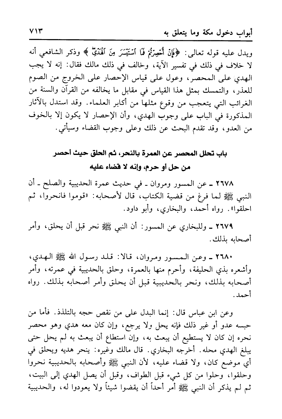 2678- عَنْ الْمِسْوَرِ وَمَرْوَانَ - فِي حَدِيثِ عُمْرَةِ الْحُدَيْبِيَةِ وَالصُّلْحِ - أَنَّ النَّبِيَّ - صلى الله عليه وسلم - لَمَّا فَرَغَ مِنْ قَضِيَّةِ الْكِتَابِ قَالَ لِأَصْحَابِهِ: «قُومُوا فَانْحَرُوا ثُمَّ احْلِقُوا» . رَوَاهُ أَحْمَدُ وَالْبُخَارِيُّ وَأَبُو دَاوُد.