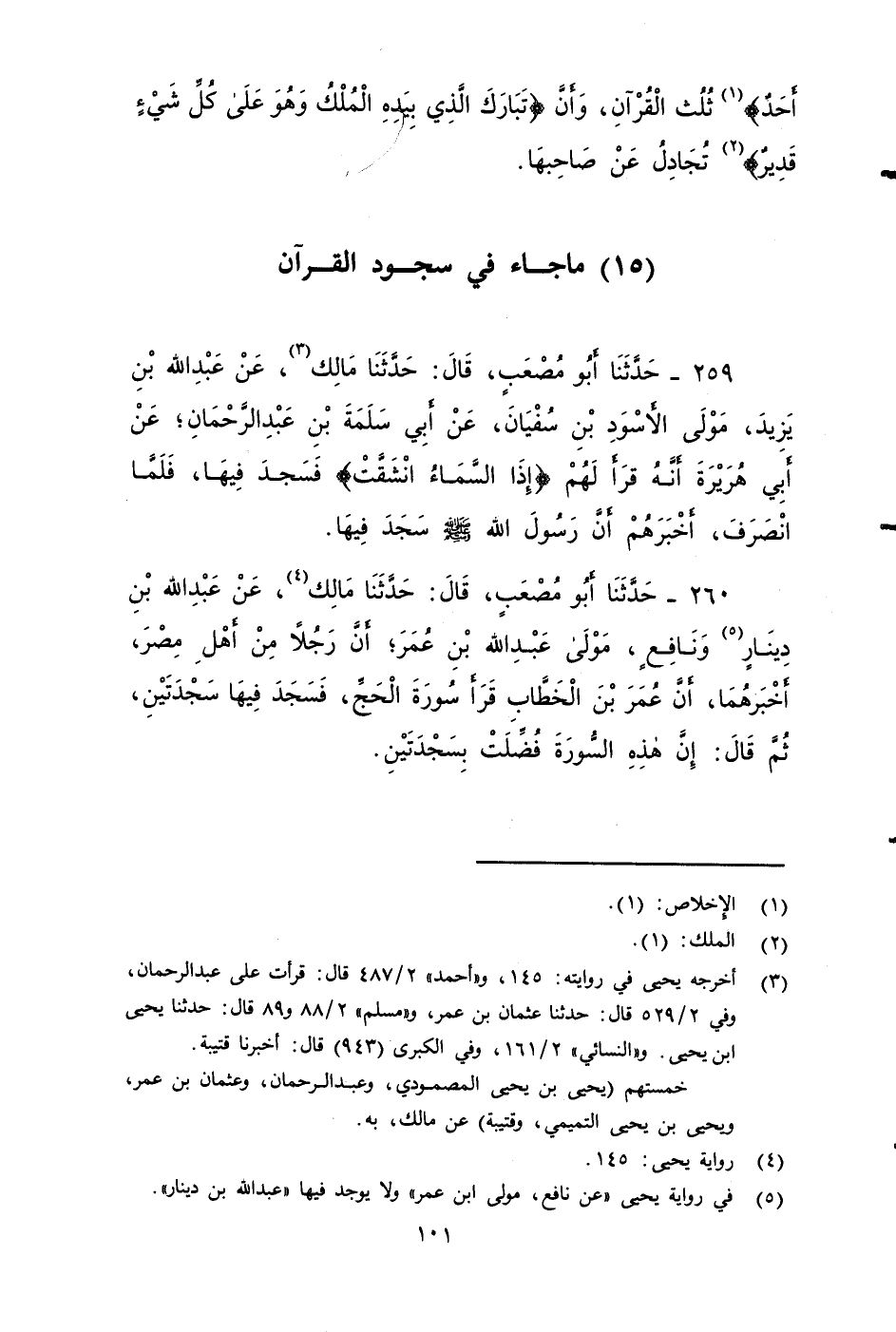 ٢٦٠ - حَدَّثَنَا أَبُو مُصْعَبٍ، قَالَ: حَدَّثَنَا مَالِكٌ، عَنْ عبد الله بن دينار ونَافِعٍ، مَوْلَى عبد الله بْنِ عُمَرَ؛ أَنَّ رَجُلاً مِنْ أَهْلِ مِصْرَ أَخْبَرَهُما , أَنَّ عُمَرَ بْنَ الْخَطَّابِ قَرَأَ سُورَةَ الْحَجِّ , فَسَجَدَ فِيهَا سَجْدَتَيْنِ، ثُمَّ قَالَ: إِنَّ هَذِهِ السُّورَةَ فُضِّلَتْ بِسَجْدَتَيْنِ.