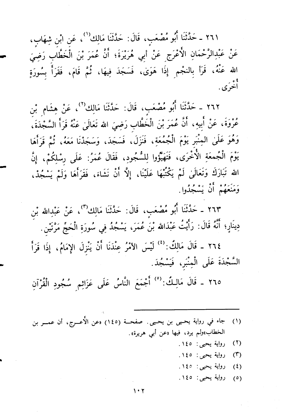 ٢٦١ - حَدَّثَنَا أَبُو مُصْعَبٍ، قَالَ: حَدَّثَنَا مَالِكٌ، عَنِ ابْنِ شِهَابٍ، عَنِ عبد الرحمن الأََعْرَجِ عن أبي هريرة، أَنَّ عُمَرَ بْنَ الْخَطَّابِ - رضي الله عنه - قَرَأَ بِـ: {وَالنَّجْمِ إِذَا هَوَى} فَسَجَدَ فِيهَا، ثُمَّ قَامَ، فَقَرَأَ بِسُورَةٍ أُخْرَى.