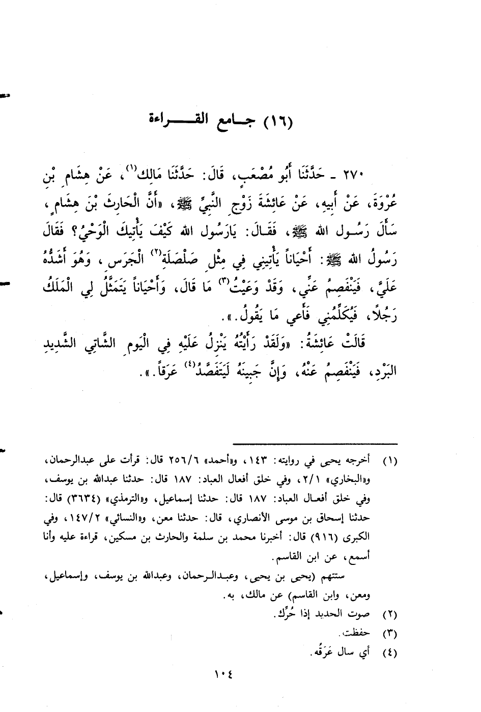 ٢٧٠ - حَدَّثَنَا أَبُو مُصْعَبٍ، قَالَ: حَدَّثَنَا مَالِكٌ، عَنْ هِشَامِ بْنِ عُرْوَةَ، عَنْ أَبِيهِ، عَنْ عَائِشَةَ زَوْجِ النَّبِيِّ صَلى الله عَلَيه وَسَلم، أَنَّ الْحَارِثَ بْنَ هِشَامٍ، سَأَلَ رَسُولَ اللَّهِ صَلى الله عَلَيه وَسَلم، فقال: يا رسول الله، كَيْفَ يَأْتِيكَ الْوَحْيُ؟ فَقَالَ رَسُولُ اللَّهِ صَلى الله عَلَيه وَسَلم: أَحْيَانًا يَأْتِينِي فِي مِثْلِ صَلْصَلَةِ الْجَرَسِ، وَهُوَ أَشَدُّهُ عَلَيَّ، فَيَفْصِمُ عَنِّي، وَقَدْ وَعَيْتُ مَا قَالَ، وَأَحْيَانًا يَتَمَثَّلُ لِي الْمَلَكُ رَجُلًا فَيُكَلِّمُنِي فَأَعِي مَا يَقُولُ.