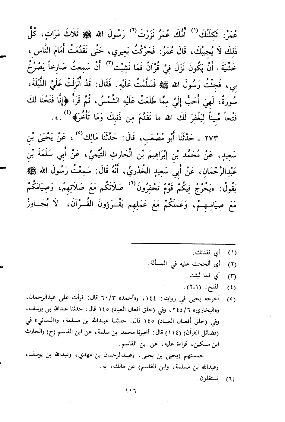 ٢٧٣ - حَدَّثَنَا أَبُو مُصْعَبٍ، قَالَ: حَدَّثَنَا مَالِكٌ، عَنْ يَحْيَى بْنِ سَعِيدٍ، عَنْ مُحَمَّدِ بْنِ إِبْرَاهِيمَ بْنِ الْحَارِثِ التَّيْمِيِّ، عَنْ أَبِي سَلَمَةَ بْنِ عَبْدِ الرَّحْمَنِ، عَنْ أَبِي سَعِيدٍ الخدري، أنه قَالَ: سَمِعْتُ رَسُولَ اللَّهِ صَلى الله عَلَيه وَسَلم، يَقُولُ: يَخْرُجُ فِيكُمْ قَوْمٌ تَحْقِرُونَ صَلَاتَكُمْ مَعَ صَلَاتِهِمْ، وَصِيَامَكُمْ مَعَ صِيَامِهِمْ، وَأَعْمَالَكُمْ مَعَ أَعْمَالِهِمْ، يَقْرَءُونَ الْقُرْآنَ لَا يُجَاوِزُ حَنَاجِرَهُمْ، يَمْرُقُونَ مِنَ الدِّينِ مُرُوقَ السَّهْمِ مِنَ الرَّمِيَّةِ، تَنْظُرُ فِي النَّصْلِ فَلَا تَرَى شَيْئًا، وَتَنْظُرُ فِي الْقِدْحِ فَلَا تَرَى شَيْئًا، وَتَنْظُرُ فِي الريش فَلَا تَرَى شَيْئًا، وَتَتَمَارَى فِي الْفُوقِ.