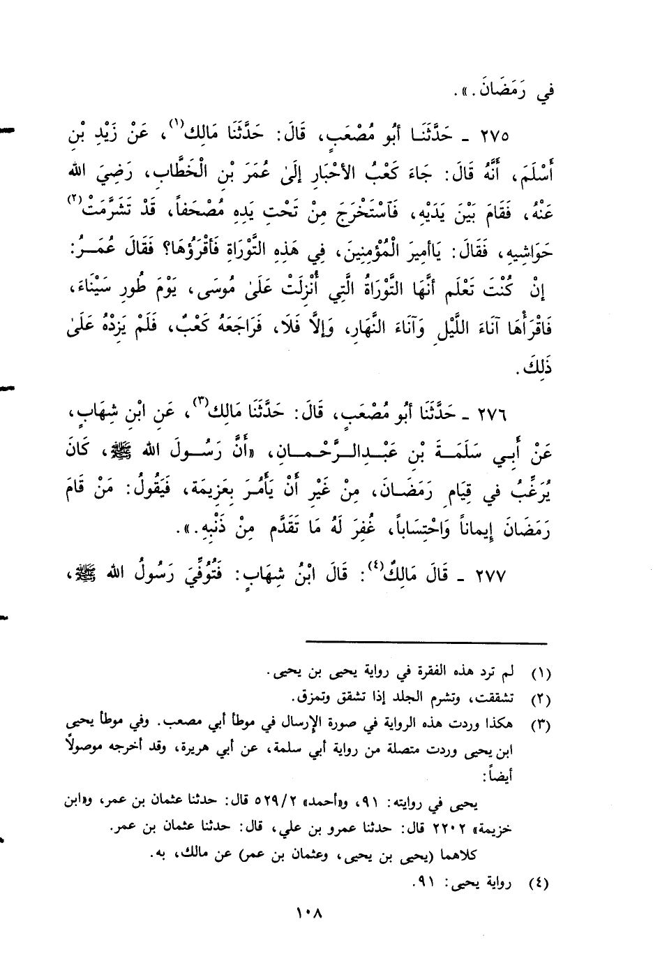 ٢٧٥ - حَدَّثَنَا أَبُو مُصْعَبٍ، قَالَ: حَدَّثَنَا مَالِكٌ، عَنْ زَيْدِ بْنِ أَسْلَمَ، أَنَّهُ قَالَ: جَاءَ كَعْبُ الأَحْبَارِ إِلَى عُمَرَ بْنِ الْخَطَّابِ، رِضَيَ اللَّهُ عَنْهُ، فَقَامَ بَيْنَ يَدَيْهِ، فَاسْتَخْرَجَ مِنْ تَحْتِ يَدِهِ مُصْحَفًا، قَدْ تَشَرَّمَتْ حَوَاشِيهِ، فَقَالَ: يَاأَمِيَر الْمُؤْمِنِينَ، فِي هَذِهِ التَّوْرَاةُ فَأَقْرَؤُهَا؟ فَقَالَ عُمَرُ: إِنْ كُنْتَ تَعْلَمُ أَنَّهَا التَّوْرَاةُ الَّتِي أُنْزِلَتْ عَلَى مُوسَى، يَوْمَ طُورِ سَيْنَاءَ، فَاقْرَأْهَا آنَاءَ اللَّيْلِ وَآنَاءَ النَّهَارِ، وَإِلَاّ فَلَا، فَرَاجَعَهُ كَعْبٌ، فَلَمْ يَزِدْهُ عَلَى ذَلِكَ.