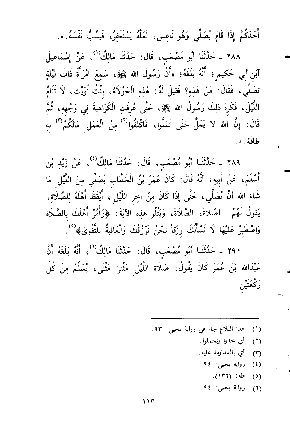 ٢٨٨ - حَدَّثَنَا أَبُو مُصْعَبٍ، قَالَ: حَدَّثَنَا مَالِكٌ، عَنْ إِسْمَاعِيلَ بْنِ أَبِي حَكِيمٍ، أَنَّهُ بَلَغَهُ، أَنَّ رَسُولَ اللهِ صَلَّى اللَّهُ عَلَيْهِ وَسَلَّمَ سَمِعَ امْرَأَةً ذات لَّيْلِة تُصَلِّي، فَقَالَ: مَنْ هَذِهِ؟ فَقِيلَ لَهُ: هَذِهِ الْحَوْلَاءُ بِنْتُ تُوَيْتٍ لَا تَنَامُ اللَّيْلَ، فَكَرِهَ ذَلِكَ رَسُولُ اللهِ صَلَّى اللَّهُ عَلَيْهِ وَسَلَّمَ، حَتَّى عُرِفَتِ الْكَرَاهِيَةُ فِي وَجْهِهِ، ثُمَّ قَالَ: إِنَّ اللَّهَ لَا يَمَلُّ حَتَّى تَمَلُّوا، فاكْلَفُوا مِنَ الْعَمَلِ مَا لَكُمْ بِهِ طَاقَةٌ.