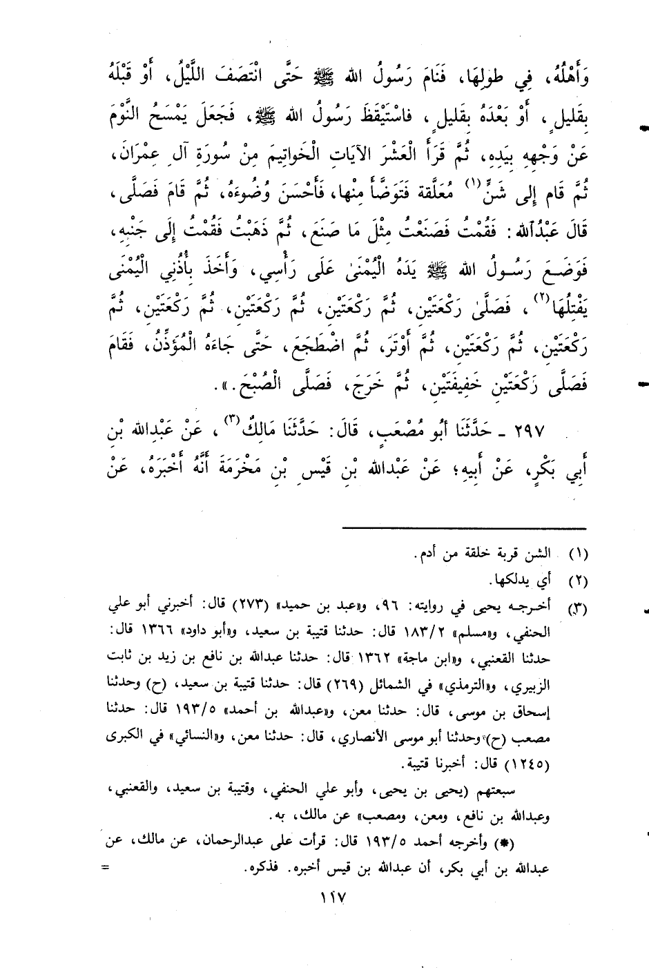 ٢٩٧ - حَدَّثَنَا أَبُو مُصْعَبٍ، قَالَ: حَدَّثَنَا مَالِكٌ، عَنْ عَبْدِ اللَّهِ بْنِ أَبِي بَكْرٍ، عَنْ أَبِيهِ، عن عَبْدَ اللَّهِ بْنَ قَيْسِ بْنِ مَخْرَمَةَ، أنه أَخْبَرَهُ، عَنْ زَيْدِ بْنِ خَالِدٍ الْجُهَنِيِّ، أَنَّهُ قَالَ: لَأَرْمُقَنَّ صَلَاةَ رَسُولِ اللَّهِ صَلى الله عَلَيه وَسَلم قَالَ: فَتَوَسَّدْتُ عَتَبَتَهُ، أَوْ فُسْطَاطَهُ، فَقَامَ فصلى رَسُولُ اللَّهِ صَلى الله عَلَيه وَسَلم ركعتين خفيفتين، ثم صَلَّى رَكْعَتَيْنِ طَوِيلَتَيْنِ طَوِيلَتَيْنِ طَوِيلَتَيْنِ، ثُمَّ صَلَّى رَكْعَتَيْنِ دُونَ اللَّتَيْنِ قَبْلَهُمَا، ثُمَّ صَلَّى رَكْعَتَيْنِ دُونَ اللَّتَيْنِ قَبْلَهُمَا، ثُمَّ صَلَّى رَكْعَتَيْنِ دُونَ اللَّتَيْنِ قَبْلَهُمَا، ثُمَّ صَلَّى رَكْعَتَيْنِ دُونَ اللَّتَيْنِ قَبْلَهُمَا، ثُمَّ أَوْتَرَ فَتِلْكَ ثَلَاثَ عَشْرَةَ رَكْعَةً.