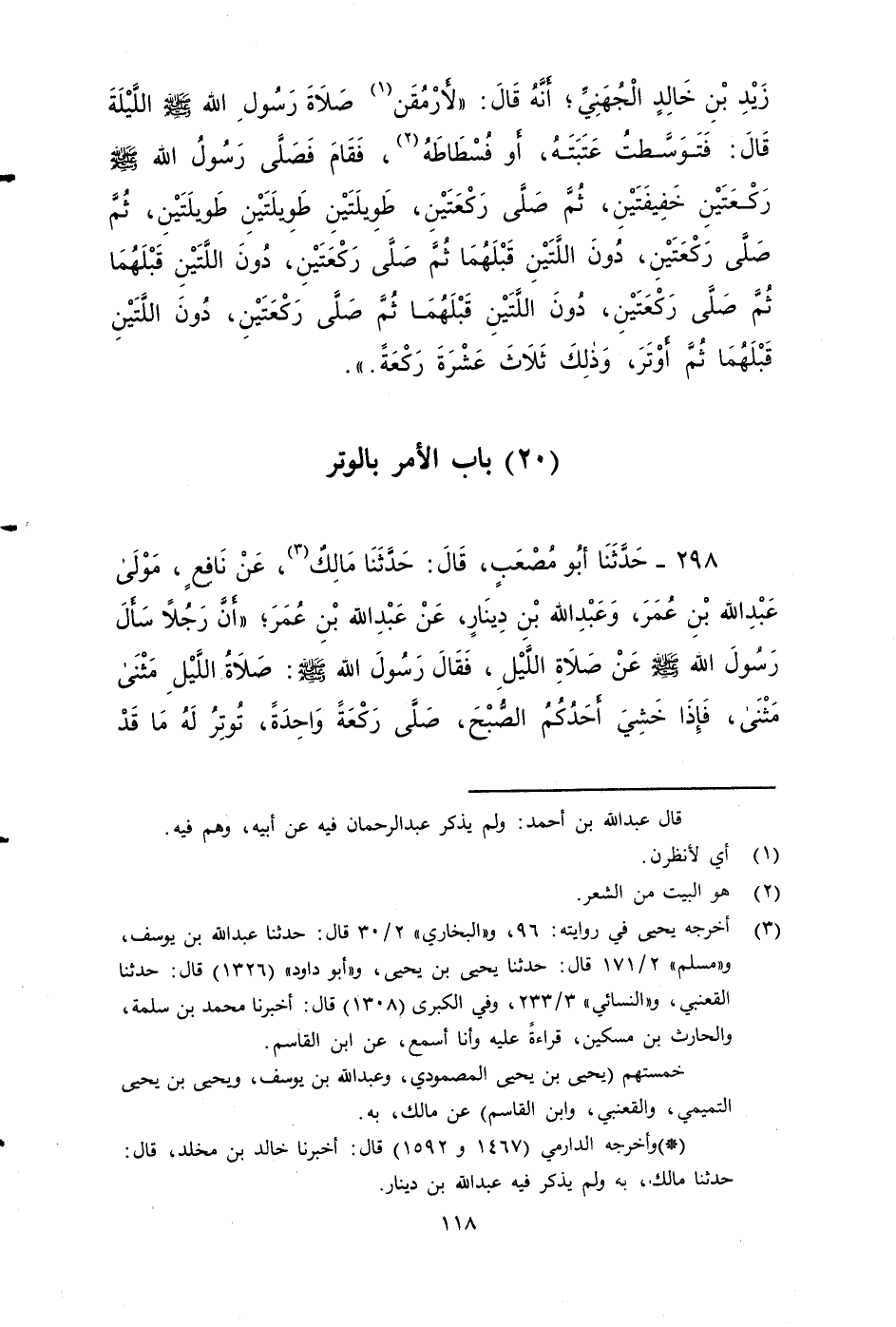 ٢٩٨ - حَدَّثَنَا أَبُو مُصْعَبٍ، قَالَ: حَدَّثَنَا مَالِكٌ، عَنْ نَافِعٍ مولى عبد الله بن عمر، وَعَبْدِ اللَّهِ بْنِ دِينَارٍ، عَنْ عَبْدِ اللَّهِ بْنِ عُمَرَ، أَنَّ رَجُلًا سَأَلَ رَسُولَ اللَّهِ صَلى الله عَلَيه وَسَلم: عَنْ صَلَاةِ اللَّيْلِ؟ فَقَالَ رَسُولُ اللَّهِ صَلى الله عَلَيه وَسَلم: صَلَاةُ اللَّيْلِ مَثْنَى مَثْنَى، فَإِذَا خَشِيَ أَحَدُكُمُ الصُّبْحَ صَلَّى رَكْعَةً وَاحِدَةً، تُوتِرُ لَهُ مَا قَدْ صَلَّى.